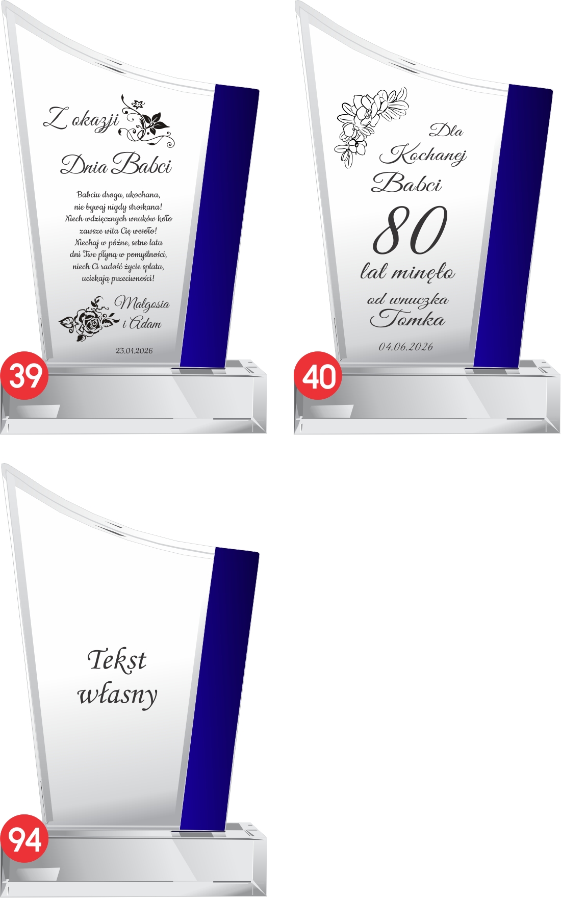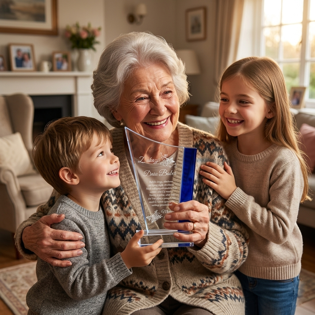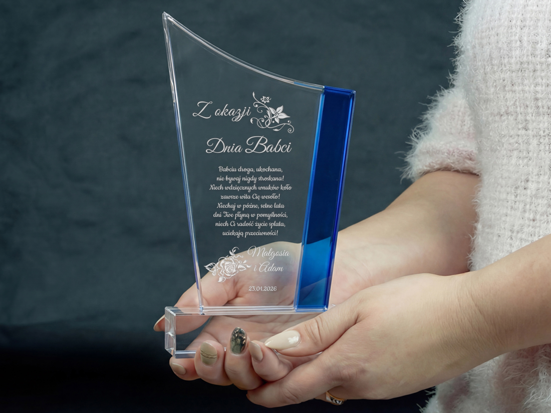 Kryształowa statuetka z eleganckim grawerem to wyjątkowy prezent na Dzień Babci, który podkreśli wdzięczność i miłość wnuków. Wykonana ze szkła kryształowego, zachwyca swoją przejrzystością i starannością wykonania, nadając prezentowi ekskluzywny wygląd. Możliwość personalizacji pozwala na umieszczenie ciepłych życzeń, ważnej daty lub wyjątkowej dedykacji prosto z serca. Jej klasyczny i ponadczasowy design sprawia, że będzie piękną ozdobą każdego wnętrza, przypominającą o wyjątkowej roli babci w rodzinie. Solidne wykonanie i dbałość o detale czynią ten upominek niezwykle wartościowym i trwałym symbolem miłości oraz szacunku. To idealny sposób, aby w wyjątkowy sposób podziękować babci za jej ciepło, wsparcie i niezapomniane chwile spędzone razem.
