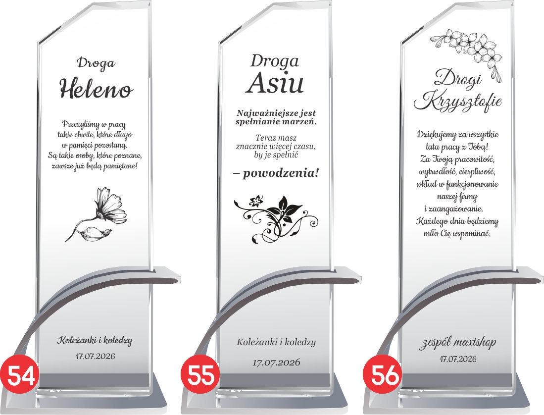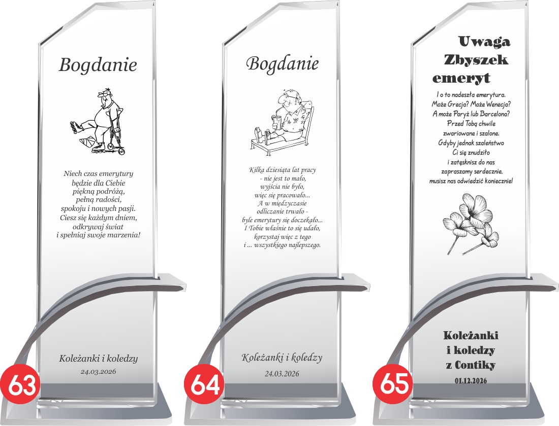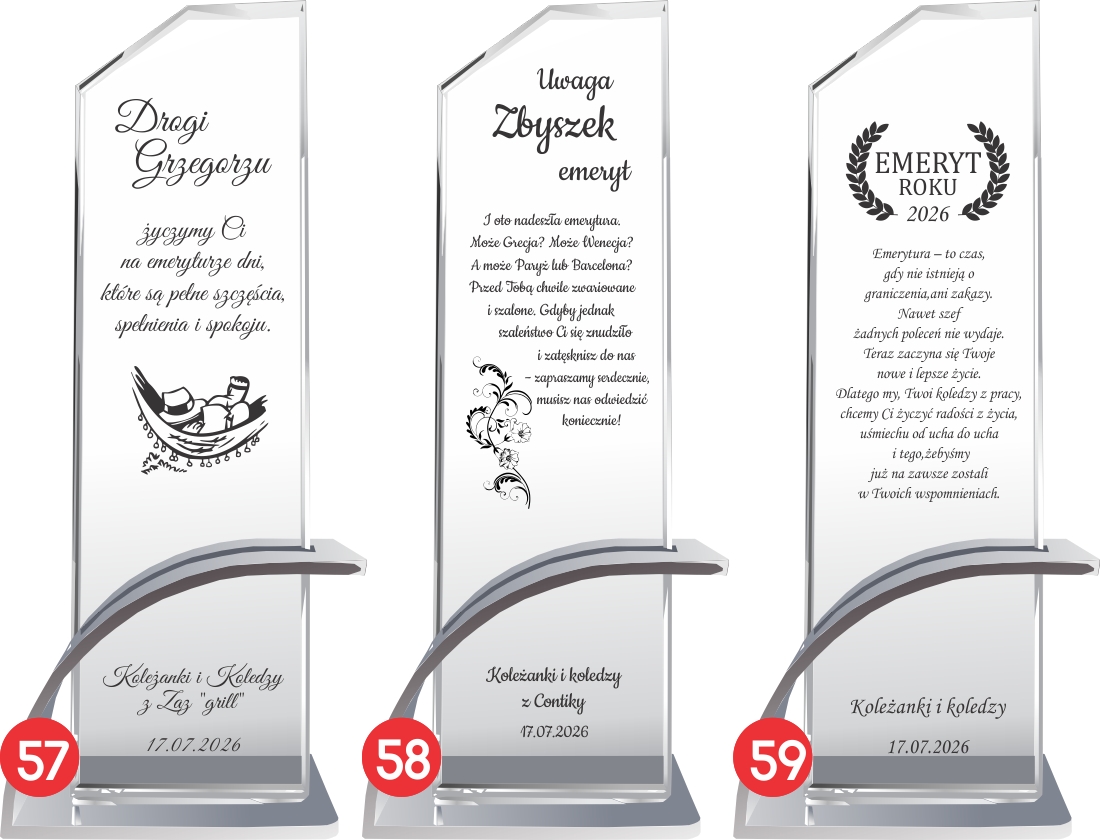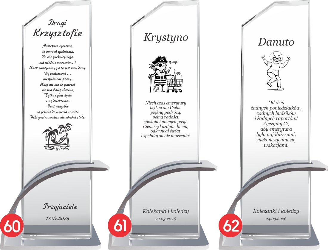 Szklana statuetka z eleganckim grawerem to doskonały sposób na uhonorowanie osoby odchodzącej na zasłużoną emeryturę. Wykonana ze szkła kryształowego, zachwyca swoim przejrzystym i ponadczasowym wyglądem, nadając prezentowi wyjątkowy charakter. Grawer podkreśla uroczysty charakter upominku, czyniąc go niepowtarzalną pamiątką na długie lata. Możliwość personalizacji pozwala na umieszczenie imienia, daty, dedykacji oraz słów wdzięczności za lata pracy i poświęcenia. Statuetka może zawierać treść związaną z wykonywanym zawodem, podkreślając znaczenie kariery zawodowej osoby obdarowanej. Wyjątkowy charakter produktu podkreśla nowoczesna, łukowata podstawa wykonana z aluminium w kolorze srebrnym, która zapewnia stabilność i luksusowy wygląd. Jej elegancki i ponadczasowy design sprawia, że stanie się nie tylko cenną pamiątką, ale także piękną ozdobą wnętrza. To wyraz uznania, wdzięczności i szacunku dla lat ciężkiej pracy oraz wkładu w rozwój firmy czy instytucji. Wręczona podczas pożegnania, statuetka będzie wzruszającym symbolem zakończenia zawodowego etapu i początkiem nowego, pełnego zasłużonego odpoczynku.
