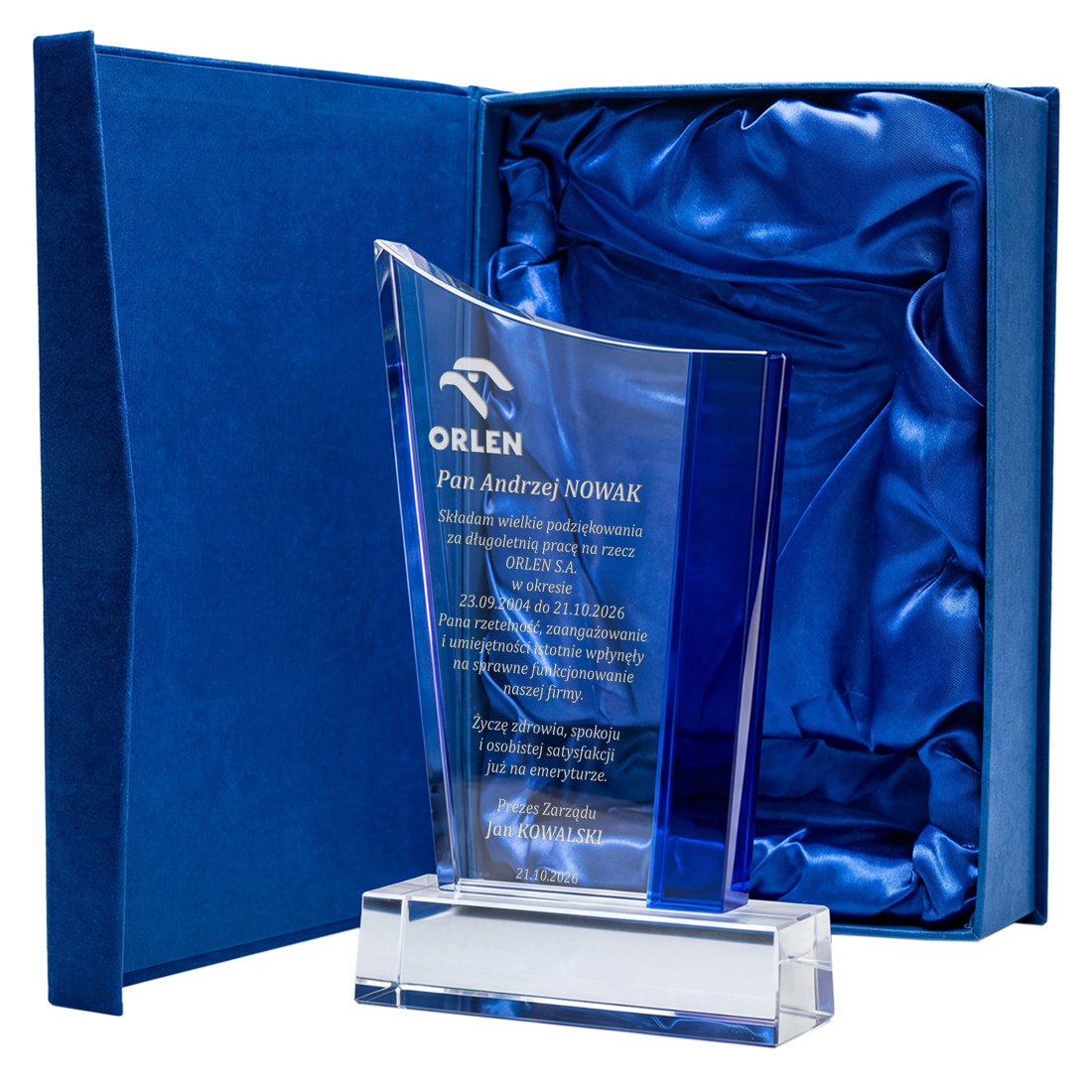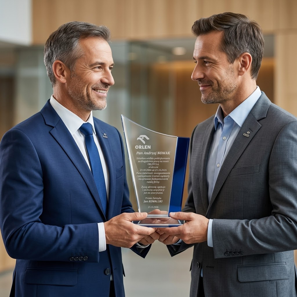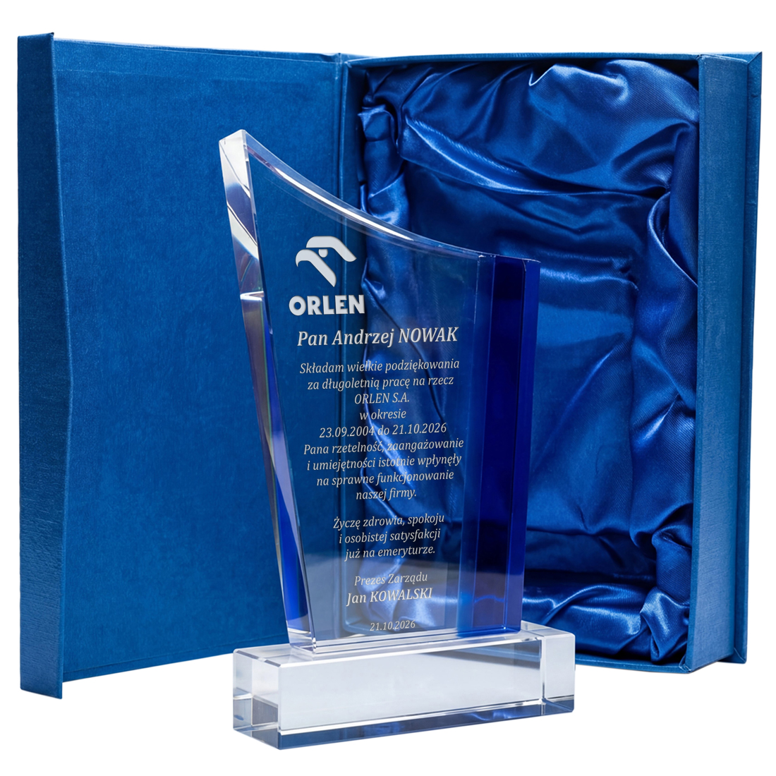Ta szklana statuetka to eleganckie połączenie nowoczesnego designu z prestiżem, stworzone, by celebrować kluczowe momenty w życiu zawodowym. Wykonana z grubego, szlifowanego szkła o wysokiej przejrzystości, stanowi idealne tło dla personalizowanego graweru, który nadaje całości unikatowy charakter. Jest to doskonały wybór, aby w godny sposób pogratulować pracownikowi awansu lub docenić jego wkład w rozwój struktur firmy. Jako nagroda korporacyjna buduje lojalność i motywuje zespół, natomiast podczas jubileuszy staje się namacalnym symbolem wieloletniej historii sukcesów organizacji. Nowoczesna technika grawerowania laserowego gwarantuje, że logotypy i dedykacje pozostaną niezmienne oraz czytelne przez dekady.