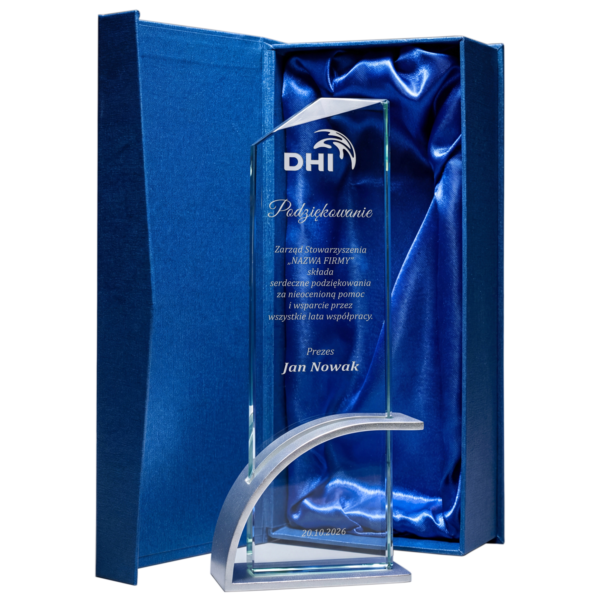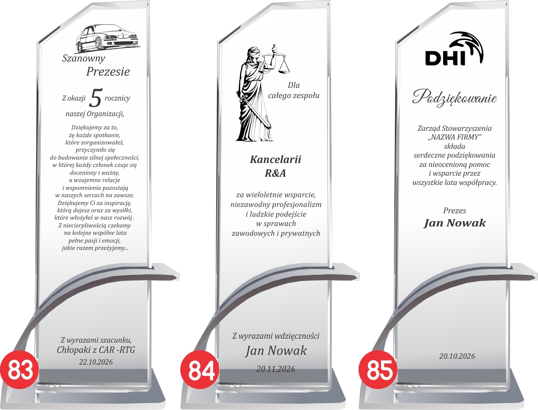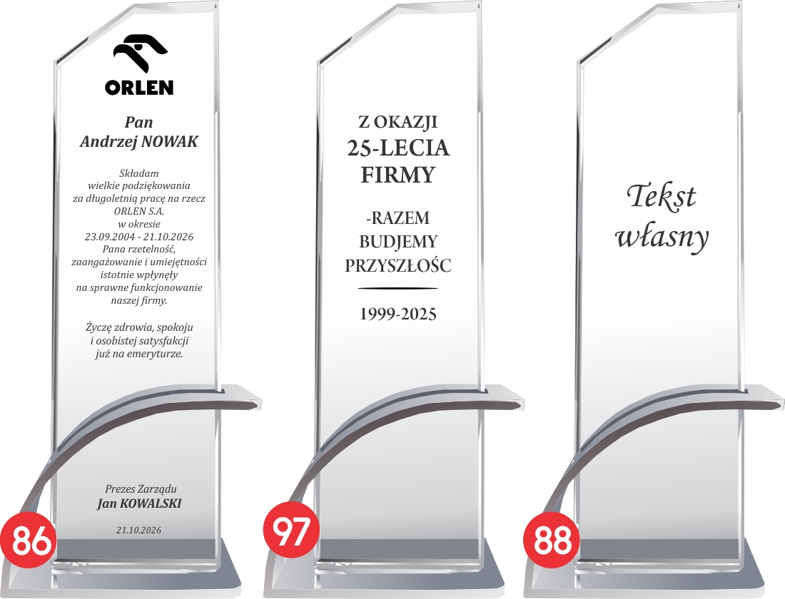 Ta szklana statuetka to eleganckie połączenie nowoczesnego designu z prestiżem, stworzone, by celebrować kluczowe momenty w życiu zawodowym. Wykonana ze szkła o wysokiej przejrzystości, stanowi idealne tło dla personalizowanego graweru, który nadaje całości unikatowy charakter. Jest to doskonały wybór, aby w godny sposób pogratulować pracownikowi awansu lub docenić jego wkład w rozwój struktur firmy. Jako nagroda korporacyjna buduje lojalność i motywuje zespół, natomiast podczas jubileuszy staje się namacalnym symbolem wieloletniej historii sukcesów organizacji. Wyjątkowy charakter produktu podkreśla nowoczesna, łukowata podstawa wykonana z aluminium w kolorze srebrnym, która zapewnia stabilność i luksusowy wygląd.Nowoczesna technika grawerowania laserowego gwarantuje, że logotypy i dedykacje pozostaną niezmienne oraz czytelne przez dekady.