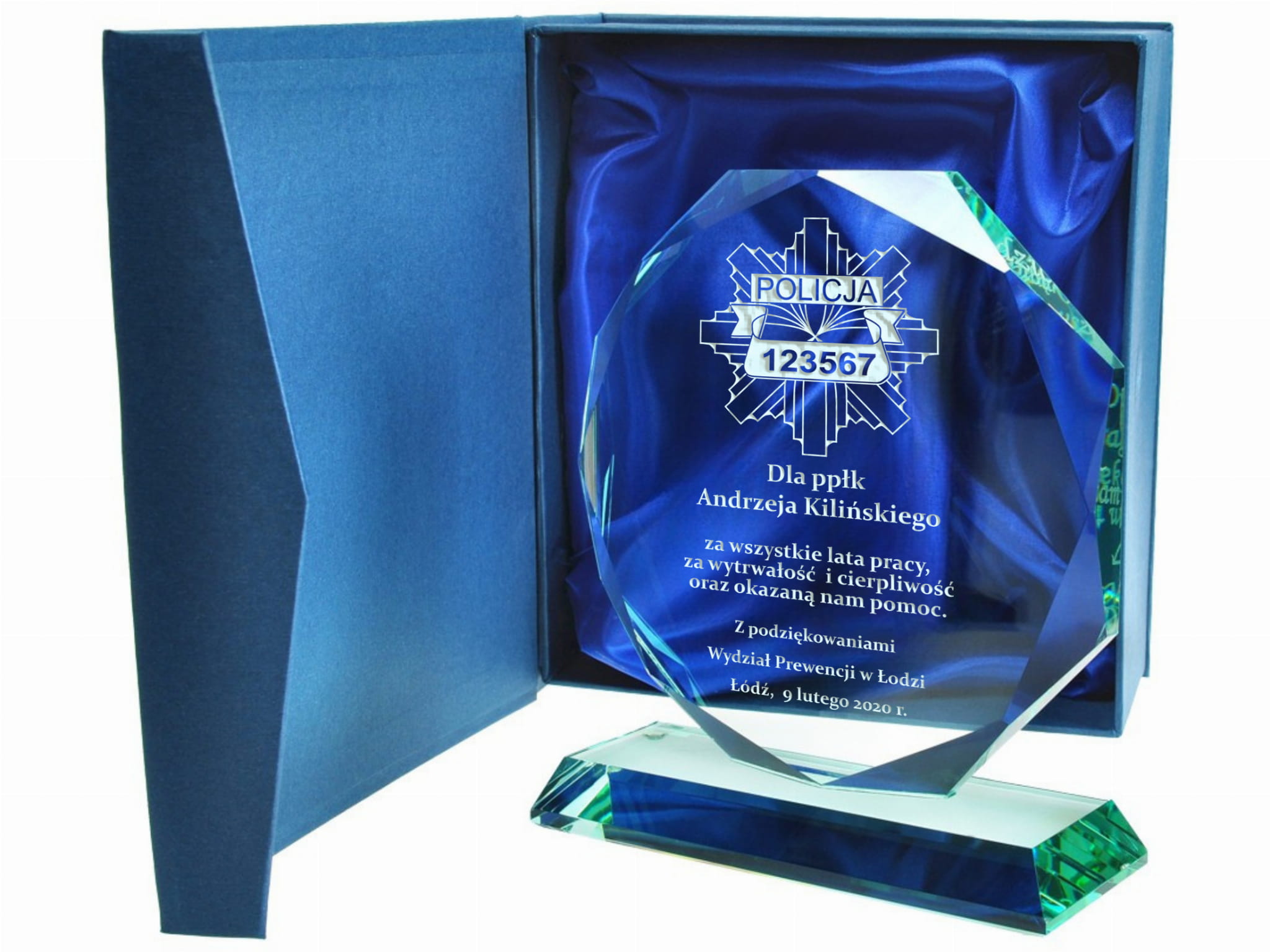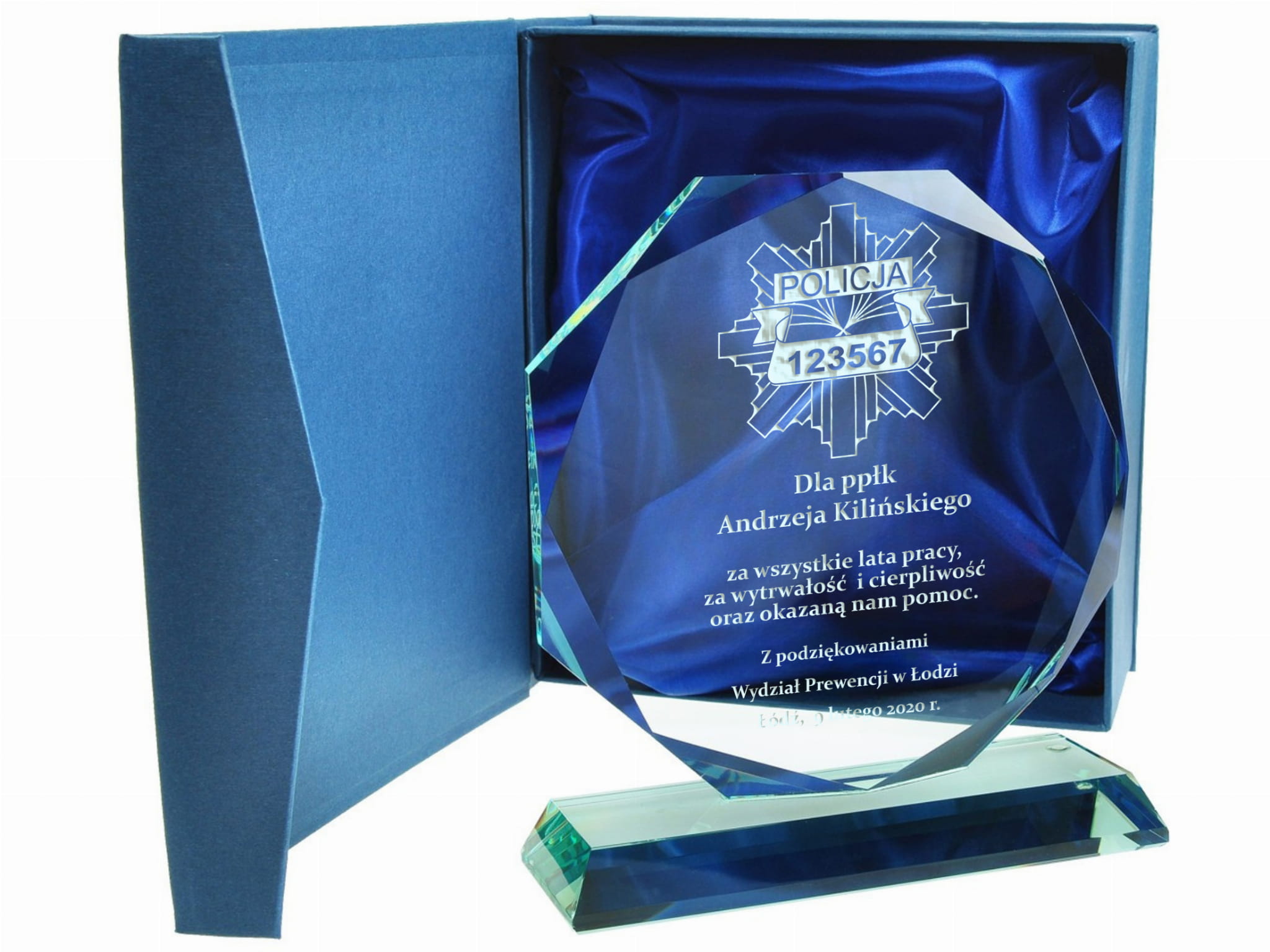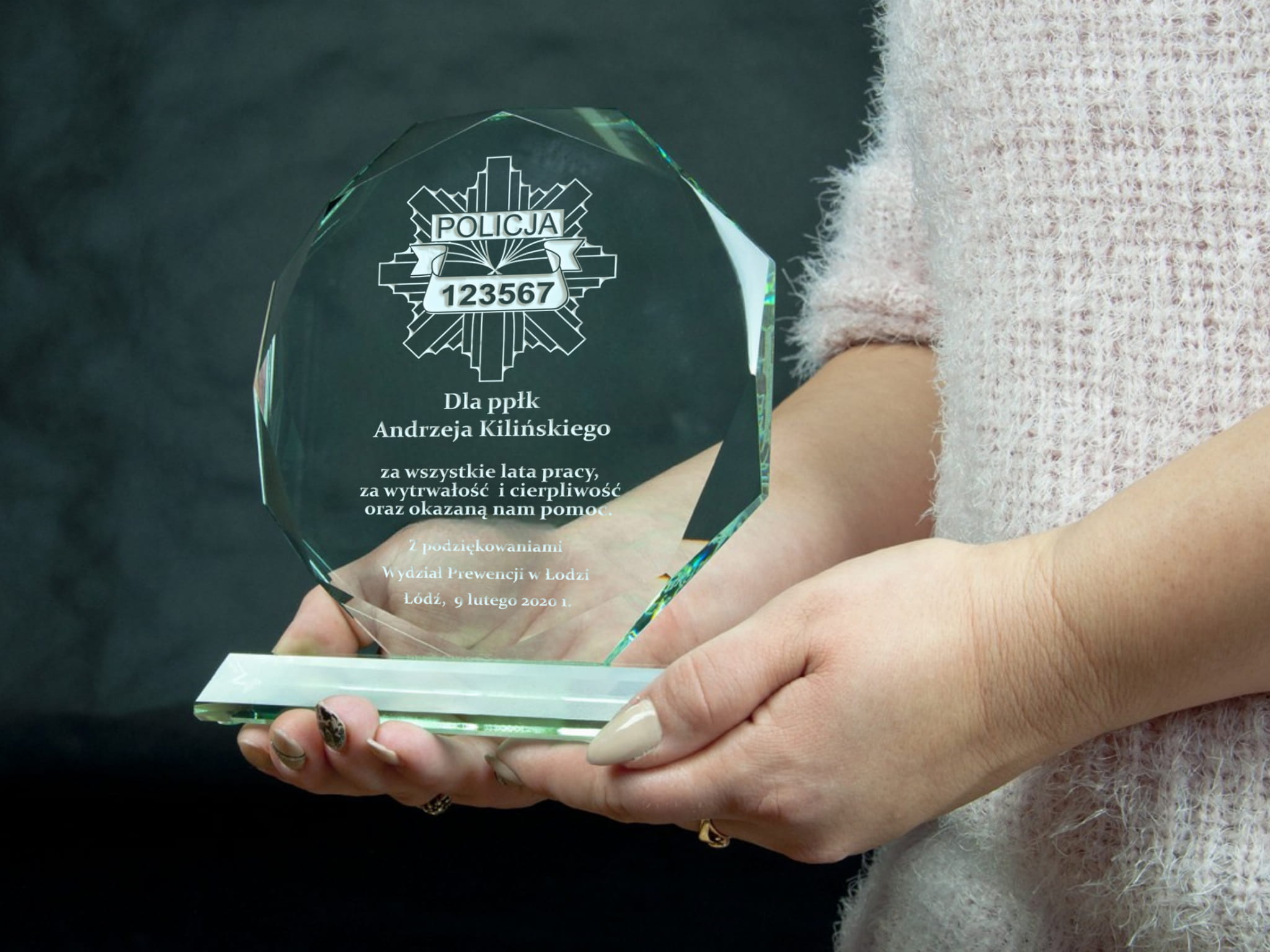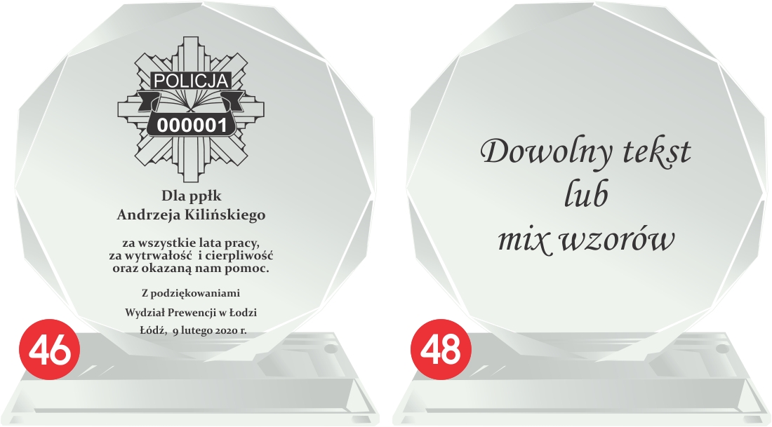 Szklana statuetka z eleganckim grawerem to doskonały sposób na uhonorowanie policjanta odchodzącego na zasłużoną emeryturę. Wykonana ze szkła, zachwyca swoim prestiżowym wyglądem i ponadczasową elegancją. Grawer w kolorze złotym lub srebrnym podkreśla wyjątkowy charakter statuetki, nadając jej uroczysty i elegancki styl. Możliwość personalizacji pozwala na umieszczenie imienia, stopnia służbowego, numeru ID odznaki oraz serdecznej dedykacji wyrażającej wdzięczność za lata poświęcenia. Statuetka może zawierać symbol policyjnej odznaki, motto formacji lub inne elementy nawiązujące do służby. Solidna konstrukcja i precyzyjne wykonanie sprawiają, że będzie to nie tylko piękna pamiątka, ale i trwały symbol honoru i oddania. Taki wyjątkowy upominek to wyraz szacunku i uznania dla wieloletniej służby na rzecz bezpieczeństwa i porządku publicznego. Wręczona podczas uroczystego pożegnania, statuetka stanie się wzruszającą pamiątką, przypominającą o latach spędzonych w mundurze i współpracy z kolegami.