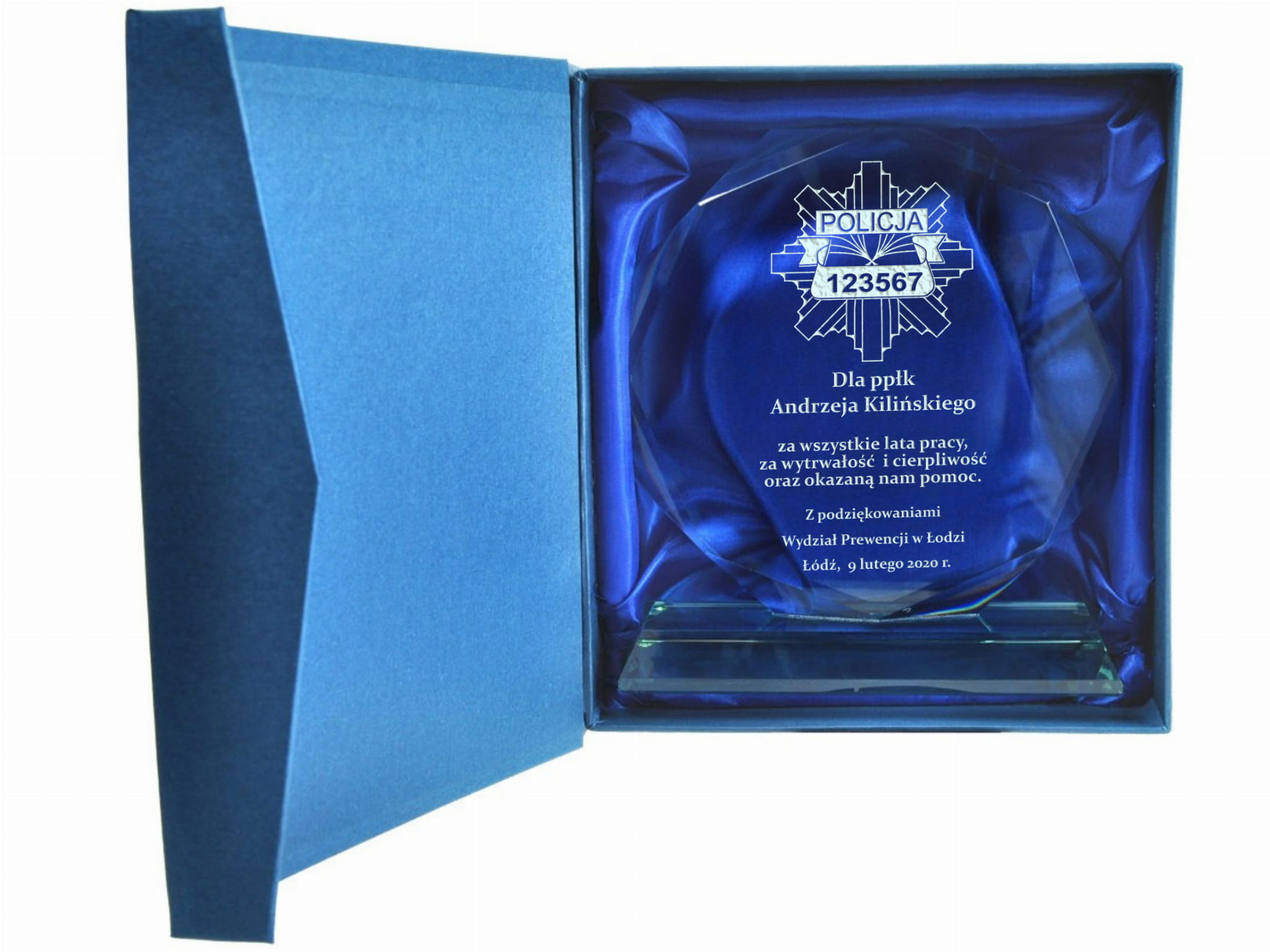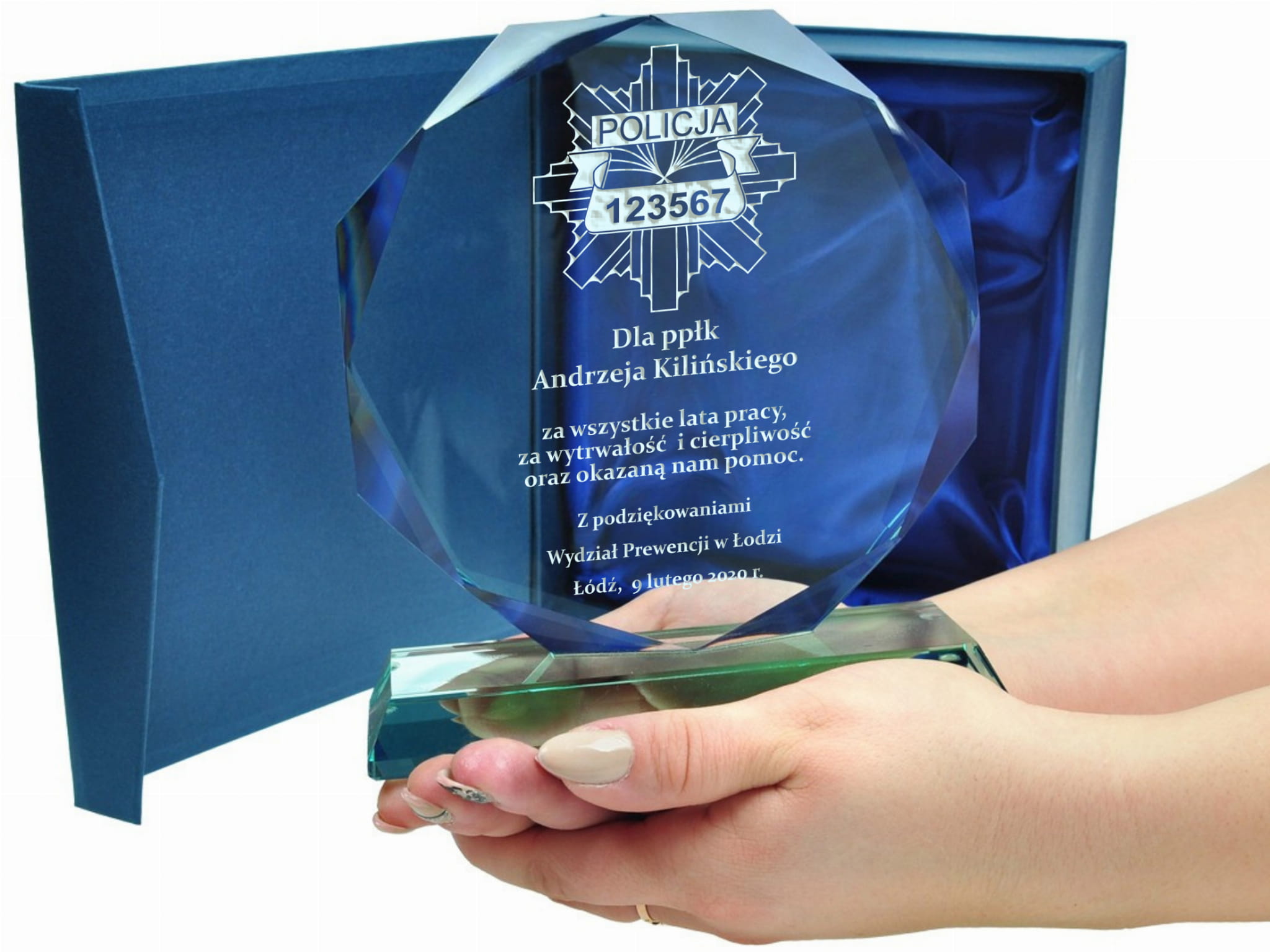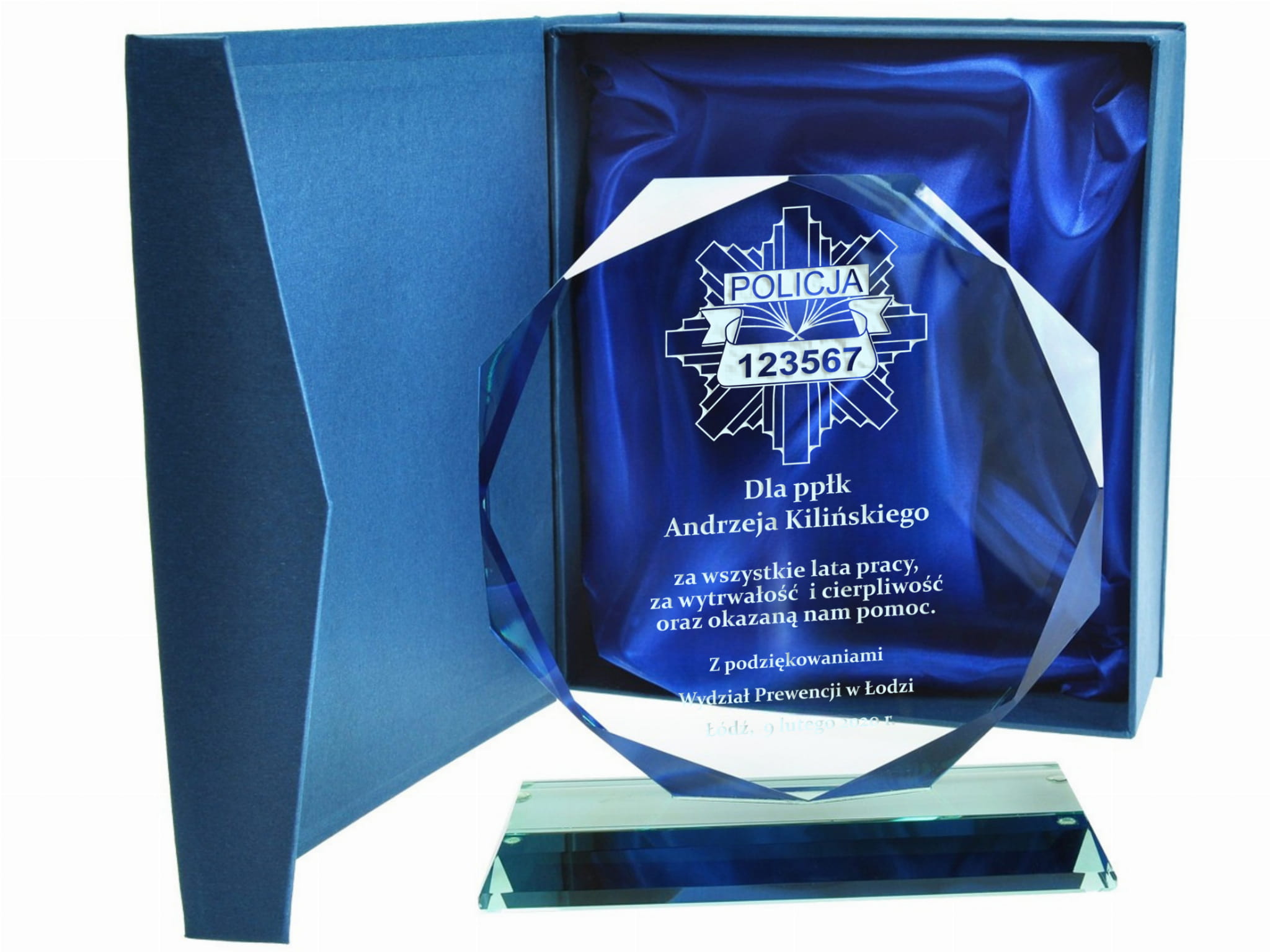 Szklana statuetka z eleganckim grawerem to doskonały sposób na uhonorowanie policjanta odchodzącego na zasłużoną emeryturę. Wykonana ze szkła, zachwyca swoim prestiżowym wyglądem i ponadczasową elegancją. Grawer w kolorze złotym lub srebrnym podkreśla wyjątkowy charakter statuetki, nadając jej uroczysty i elegancki styl. Możliwość personalizacji pozwala na umieszczenie imienia, stopnia służbowego, numeru ID odznaki oraz serdecznej dedykacji wyrażającej wdzięczność za lata poświęcenia. Statuetka może zawierać symbol policyjnej odznaki, motto formacji lub inne elementy nawiązujące do służby. Solidna konstrukcja i precyzyjne wykonanie sprawiają, że będzie to nie tylko piękna pamiątka, ale i trwały symbol honoru i oddania. Taki wyjątkowy upominek to wyraz szacunku i uznania dla wieloletniej służby na rzecz bezpieczeństwa i porządku publicznego. Wręczona podczas uroczystego pożegnania, statuetka stanie się wzruszającą pamiątką, przypominającą o latach spędzonych w mundurze i współpracy z kolegami.