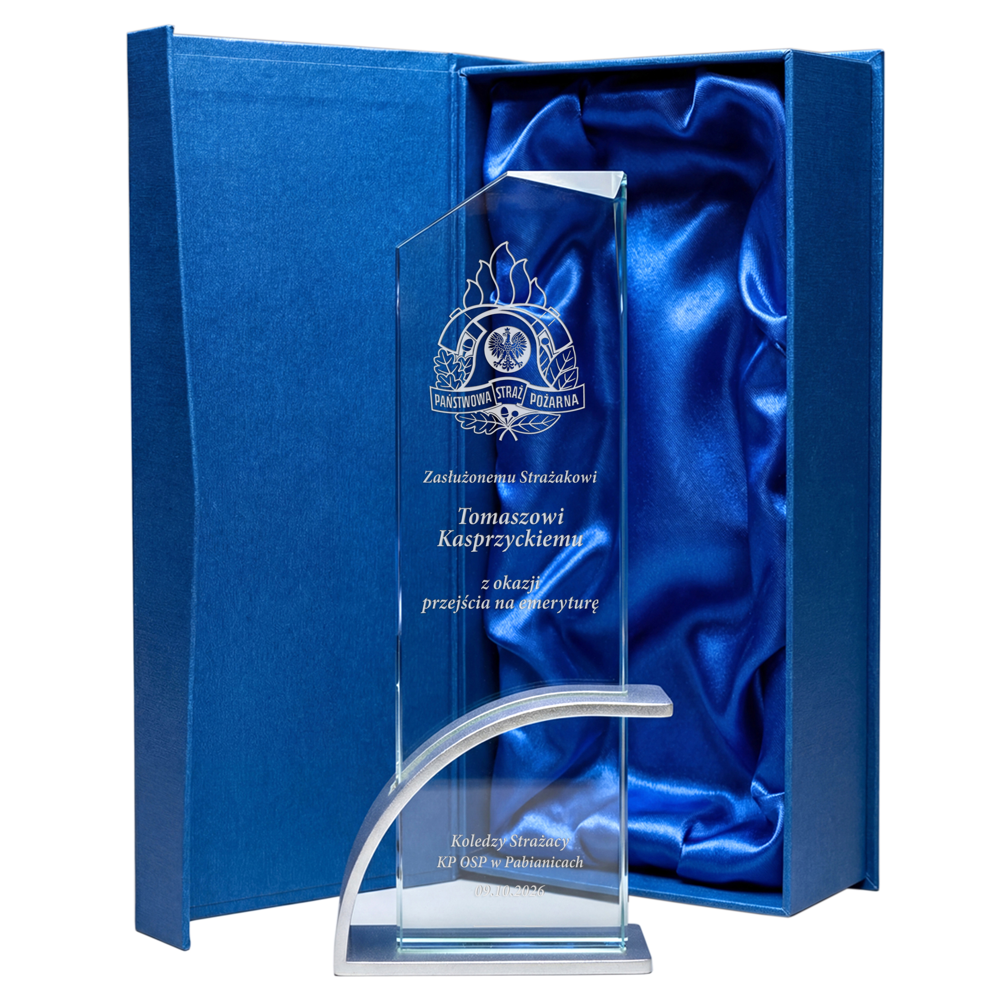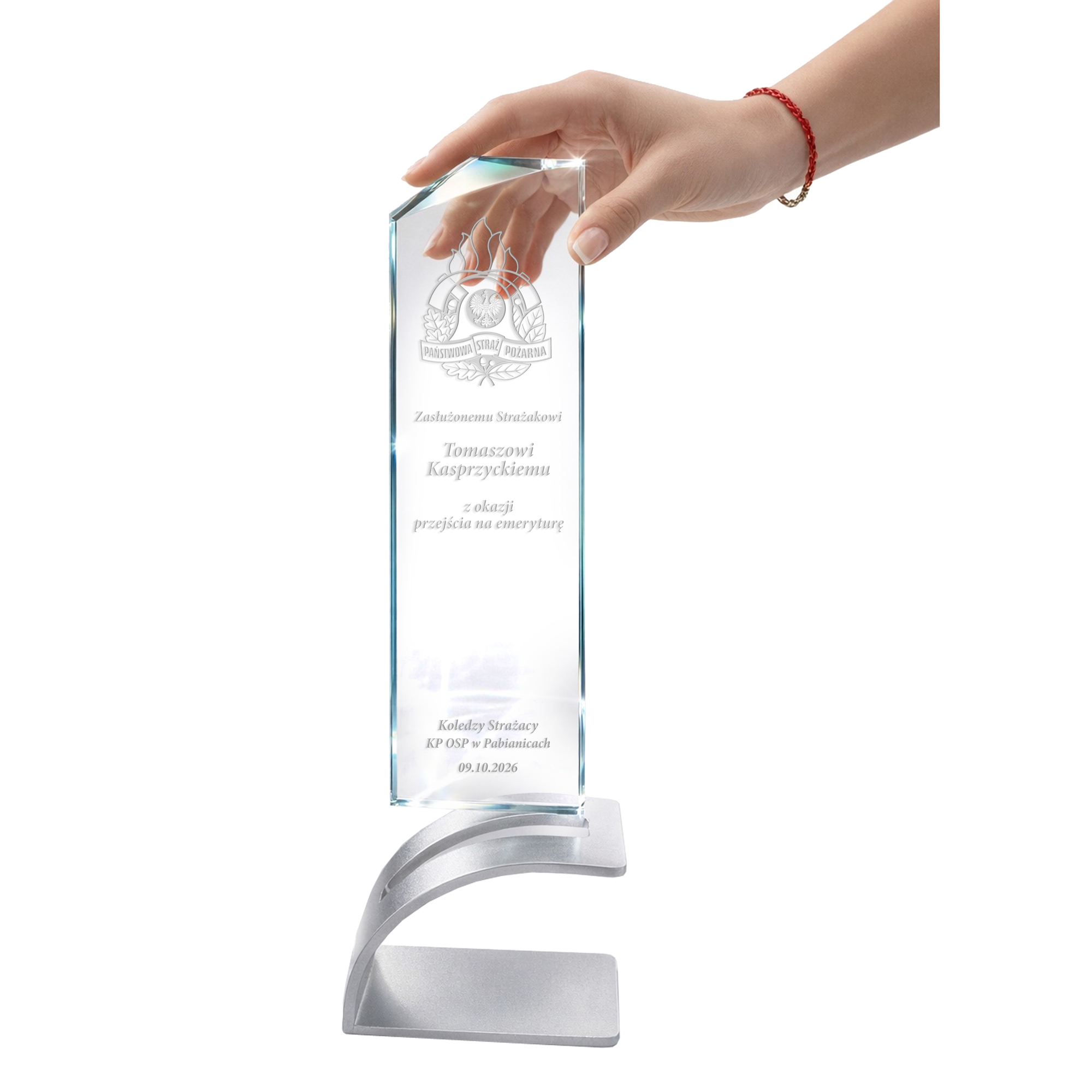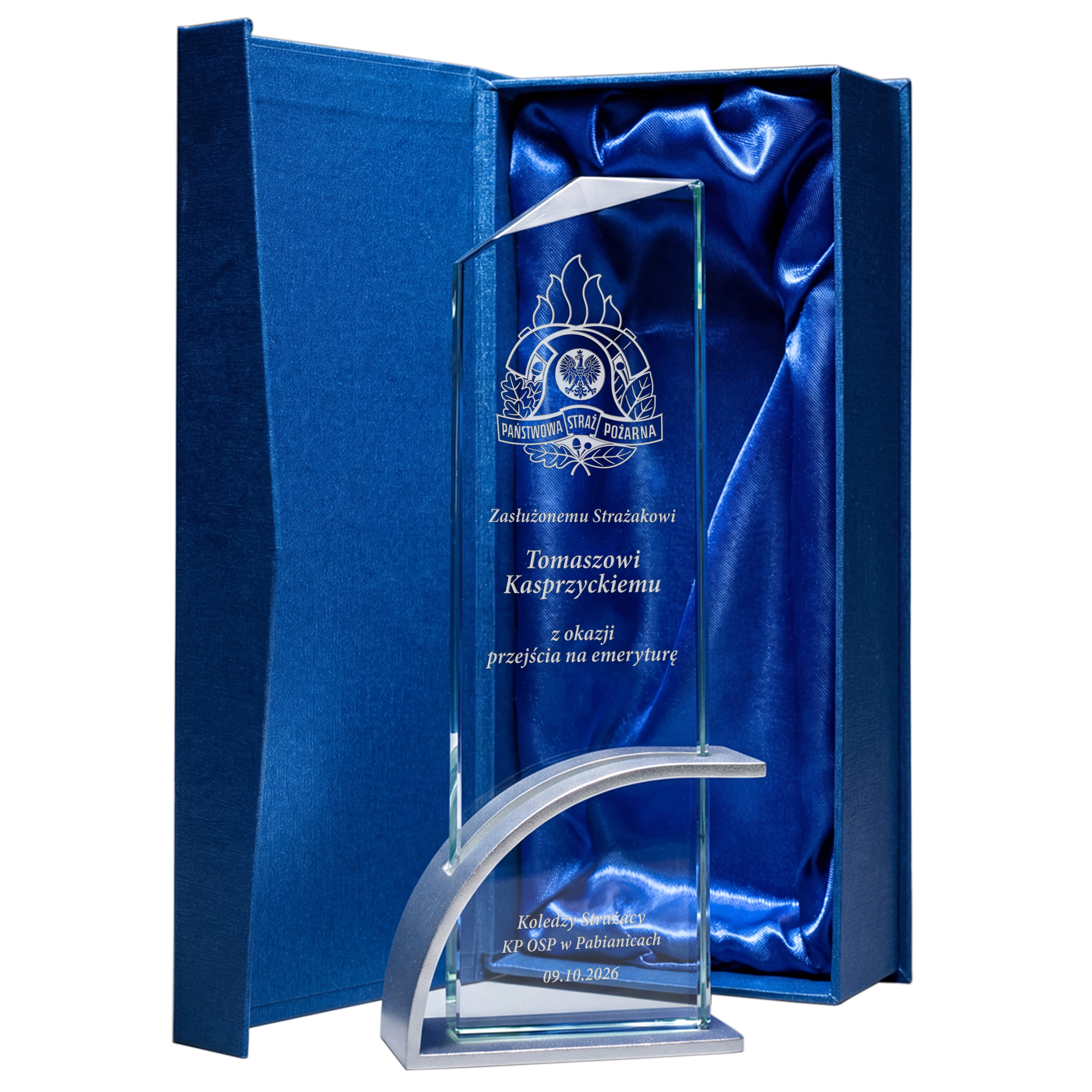Uhonoruj lata niebezpiecznej i ofiarnej służby w Straży Pożarnej prestiżową statuetką szklaną z indywidualnym grawerem. To wyjątkowa forma podziękowania dla strażaka odchodzącego na emeryturę lub awans, stanowiąca trwały dowód uznania za trud włożony w ratowanie życia i mienia. Wyjątkowy charakter produktu podkreśla nowoczesna, łukowata podstawa wykonana z aluminium w kolorze srebrnym, która zapewnia stabilność i luksusowy wygląd. Wykonana z krystalicznego szkła o perfekcyjnie szlifowanych krawędziach, statuetka emanuje profesjonalizmem i szacunkiem do munduru. Dzięki precyzyjnej technologii laserowej na powierzchni szkła naniesiemy logo PSP lub OSP oraz osobistą dedykację od kolegów z jednostki. Nowoczesny design sprawia, że pamiątka będzie dumnie eksponowana w domowej gablocie, przypominając o latach strażackiej służby. Produkt dostarczany jest w dedykowanym etui, co czyni go gotowym do uroczystego wręczenia podczas zdania zmiany lub apelu. Wybierz jakość, która godnie podsumuje lata służby pod hasłem "Bogu na chwałę, ludziom na pożytek".
