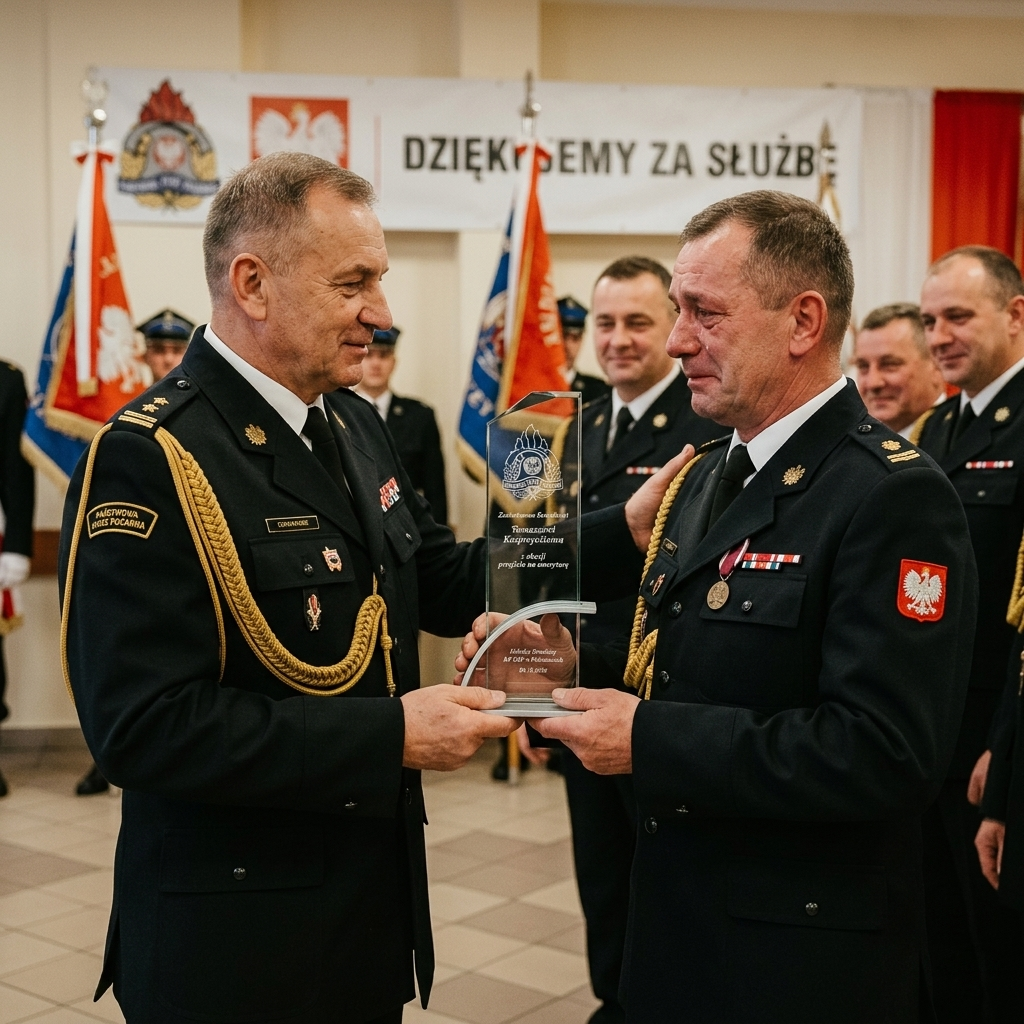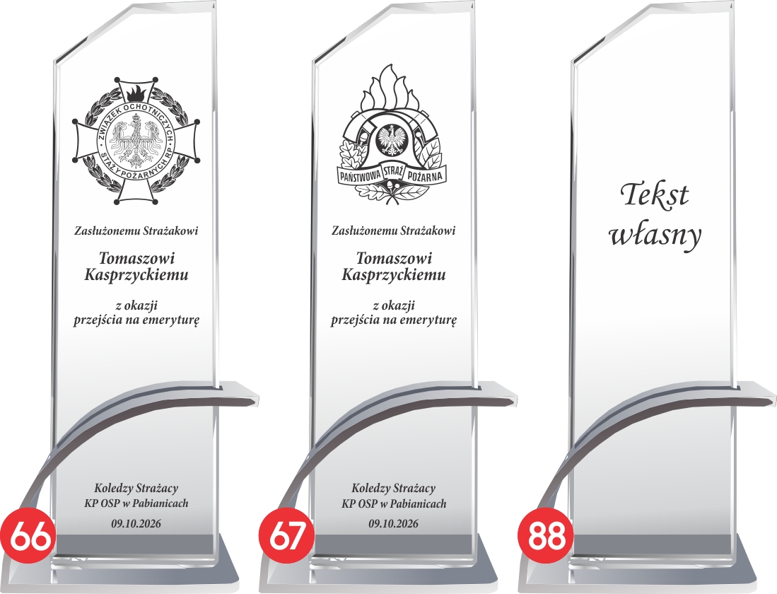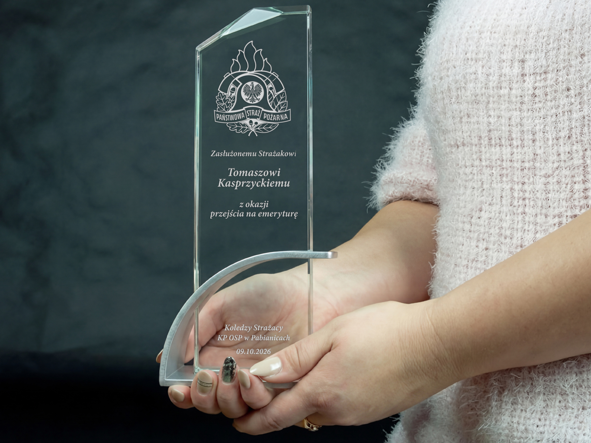 Uhonoruj lata niebezpiecznej i ofiarnej służby w Straży Pożarnej prestiżową statuetką szklaną z indywidualnym grawerem. To wyjątkowa forma podziękowania dla strażaka odchodzącego na emeryturę lub awans, stanowiąca trwały dowód uznania za trud włożony w ratowanie życia i mienia. Wyjątkowy charakter produktu podkreśla nowoczesna, łukowata podstawa wykonana z aluminium w kolorze srebrnym, która zapewnia stabilność i luksusowy wygląd. Wykonana z krystalicznego szkła o perfekcyjnie szlifowanych krawędziach, statuetka emanuje profesjonalizmem i szacunkiem do munduru. Dzięki precyzyjnej technologii laserowej na powierzchni szkła naniesiemy logo PSP lub OSP oraz osobistą dedykację od kolegów z jednostki. Nowoczesny design sprawia, że pamiątka będzie dumnie eksponowana w domowej gablocie, przypominając o latach strażackiej służby. Produkt dostarczany jest w dedykowanym etui, co czyni go gotowym do uroczystego wręczenia podczas zdania zmiany lub apelu. Wybierz jakość, która godnie podsumuje lata służby pod hasłem "Bogu na chwałę, ludziom na pożytek".