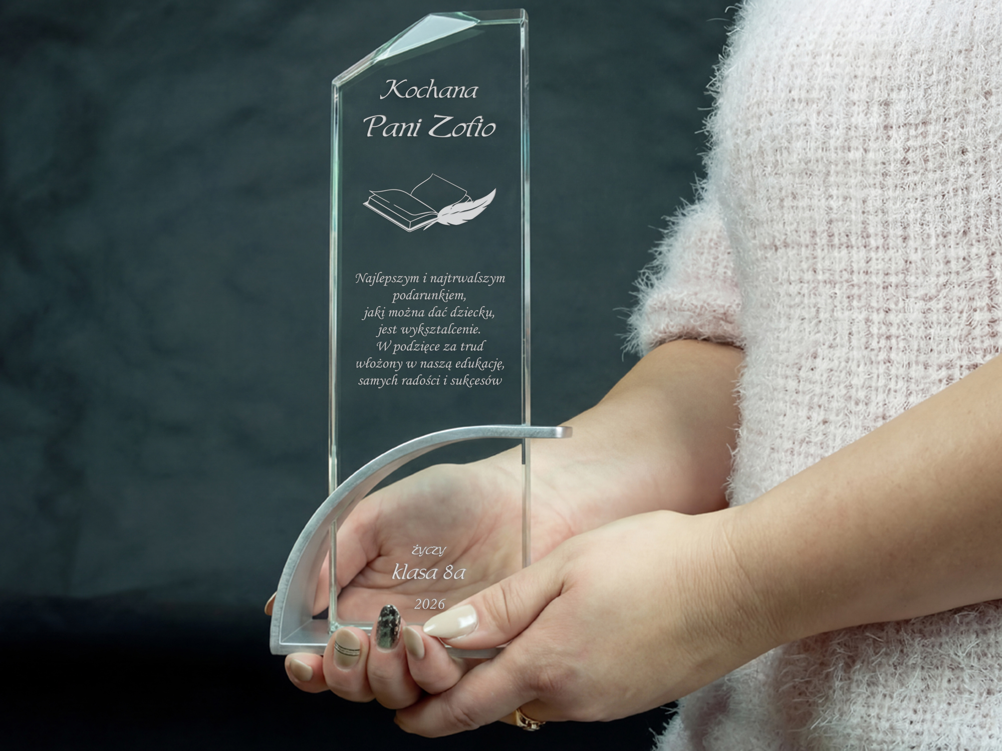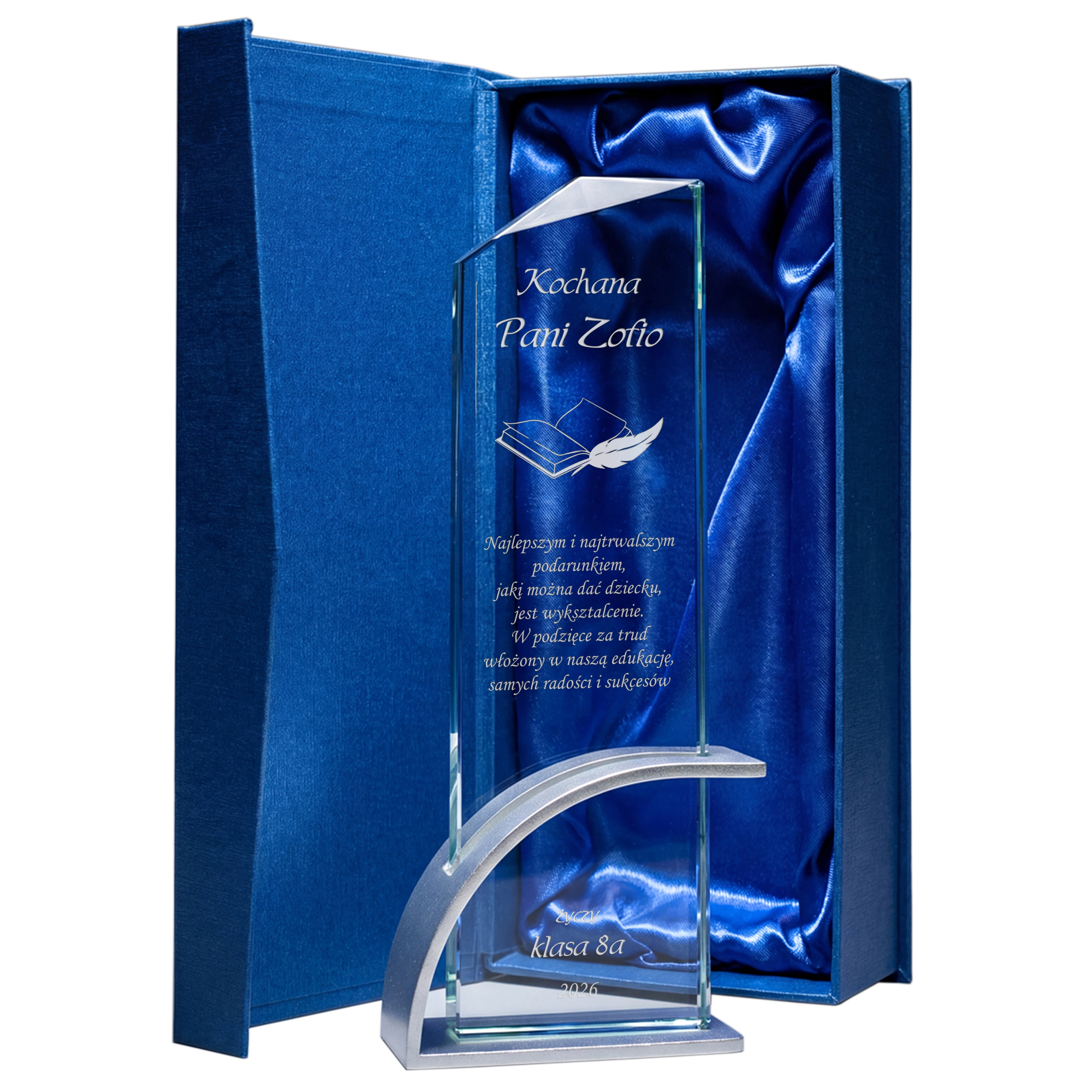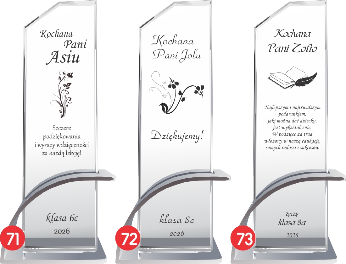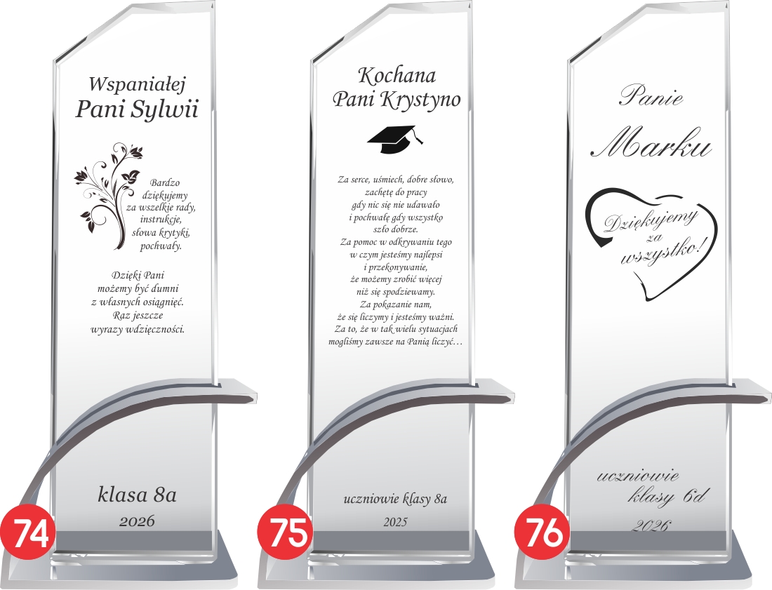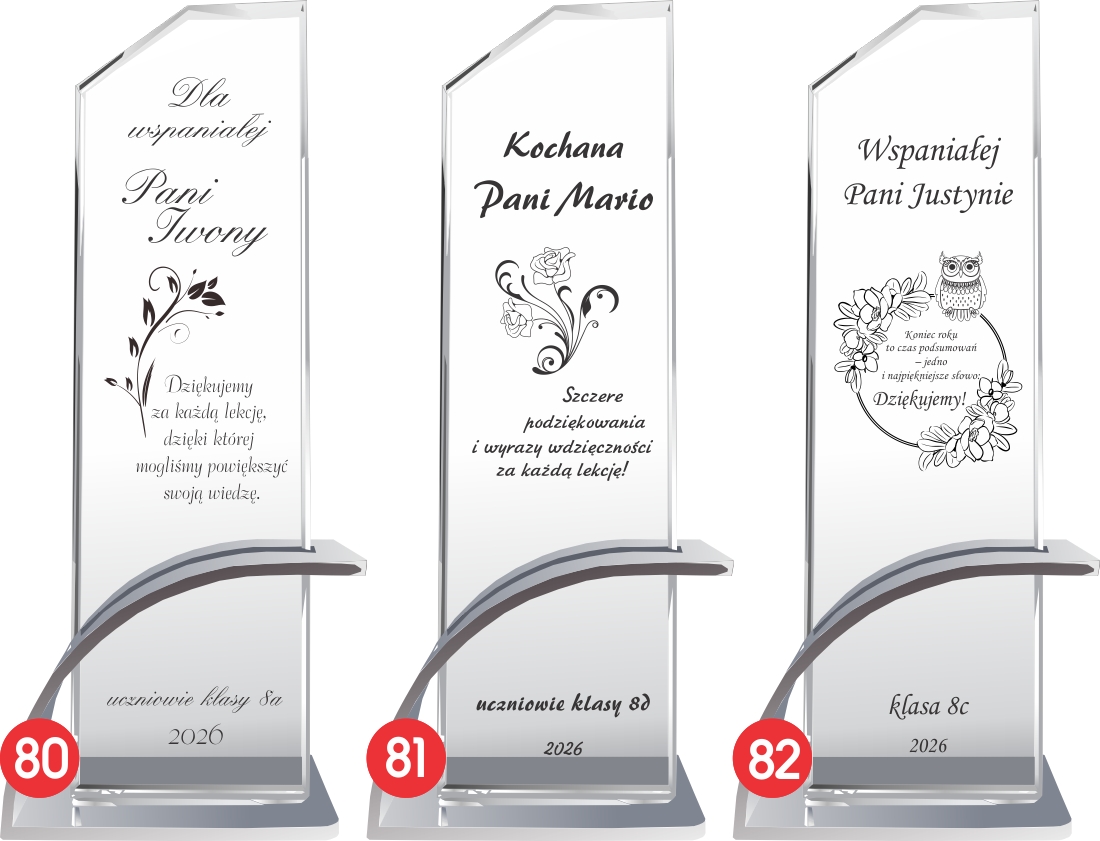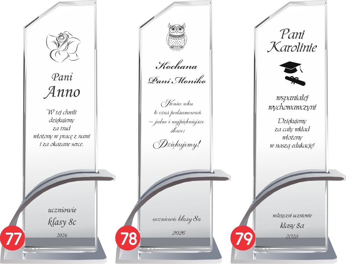 Szklana statuetka z eleganckim grawerem to wyjątkowy upominek, który doskonale wyrazi wdzięczność dla nauczyciela z okazji Dnia Nauczyciela lub zakończenia roku szkolnego. Wykonana ze szkła kryształowego, zachwyca swoim przejrzystym i eleganckim wyglądem, podkreślając wyjątkowy charakter prezentu. Wyjątkowy charakter produktu podkreśla nowoczesna, łukowata podstawa wykonana z aluminium w kolorze srebrnym, która zapewnia stabilność i luksusowy wygląd. Grawer dodaje statuetce klasy i sprawia, że stanie się piękną pamiątką na długie lata. Możliwość personalizacji pozwala na umieszczenie imienia nauczyciela, wyjątkowej dedykacji, daty oraz serdecznych podziękowań od uczniów. Jej ponadczasowy design sprawia, że będzie doskonałą ozdobą biurka lub gabloty, przypominającą o pięknych chwilach spędzonych z uczniami. Solidne wykonanie i dbałość o detale sprawiają, że ten prezent nabiera szczególnej wartości i podkreśla szacunek dla pracy pedagoga. To idealny sposób, aby podziękować nauczycielowi za trud włożony w edukację, cierpliwość i inspirację, którą przekazuje kolejnym pokoleniom.