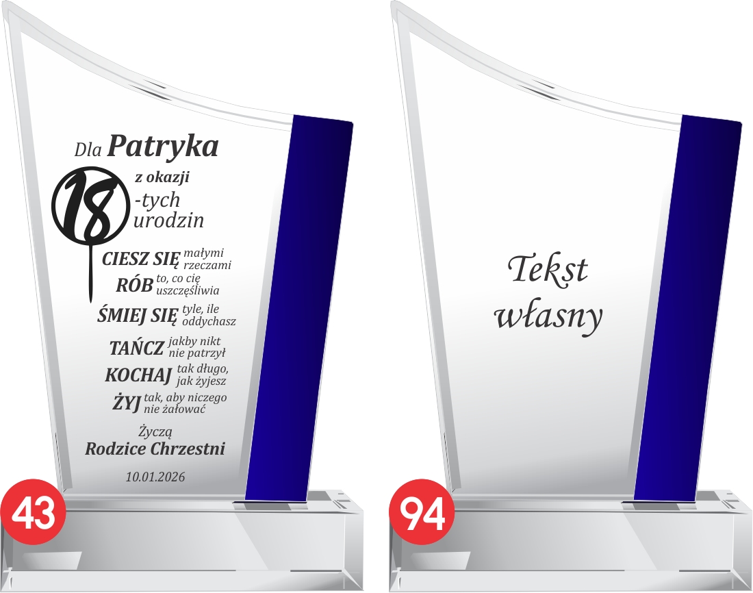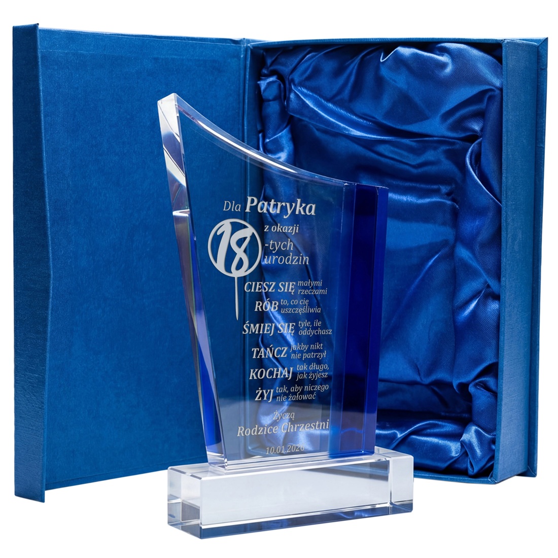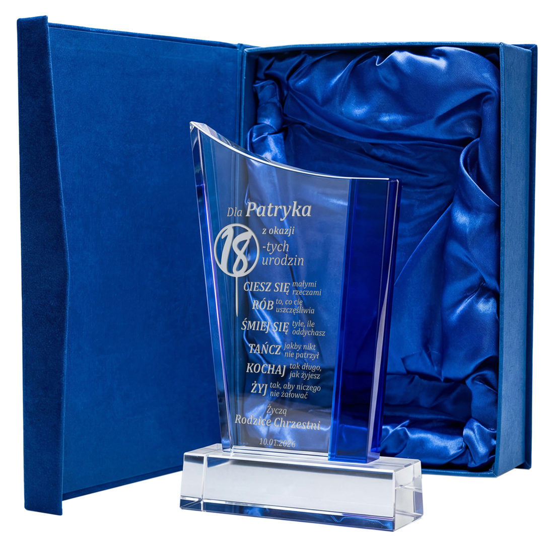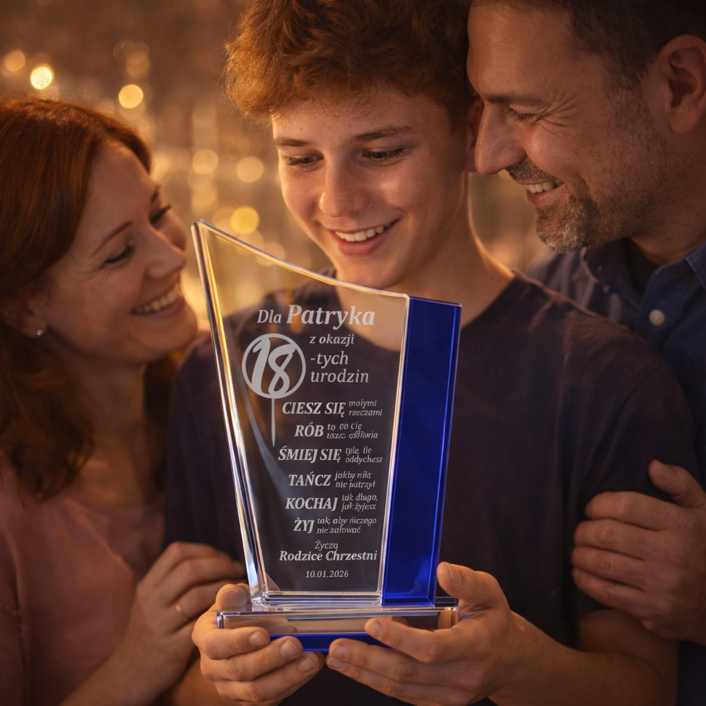 Elegancka statuetka wykonana z grubego, krystalicznie czystego szkła kryształowego to doskonały sposób na uczczenie przełomowych 18. urodzin. Dzięki zastosowaniu precyzyjnej technologii grawerowania laserowego, każde imię, data oraz osobiste życzenia zyskują wyjątkowy, nieścieralny charakter. Produkt ten stanowi nowoczesną alternatywę dla klasycznych kartek, stając się trwałą pamiątką wejścia w dorosłość na długie lata. Forma statuetki oraz profesjonalnie szlifowane krawędzie sprawiają, że idealnie komponuje się ona z każdym wystrojem wnętrza. Każdy egzemplarz dostarczany jest w gustownym etui, dzięki czemu otrzymują Państwo prezent gotowy do wręczenia. To prestiżowy wybór dla osób szukających upominku, który łączy w sobie wysoką estetykę z głębokim, emocjonalnym przesłaniem.