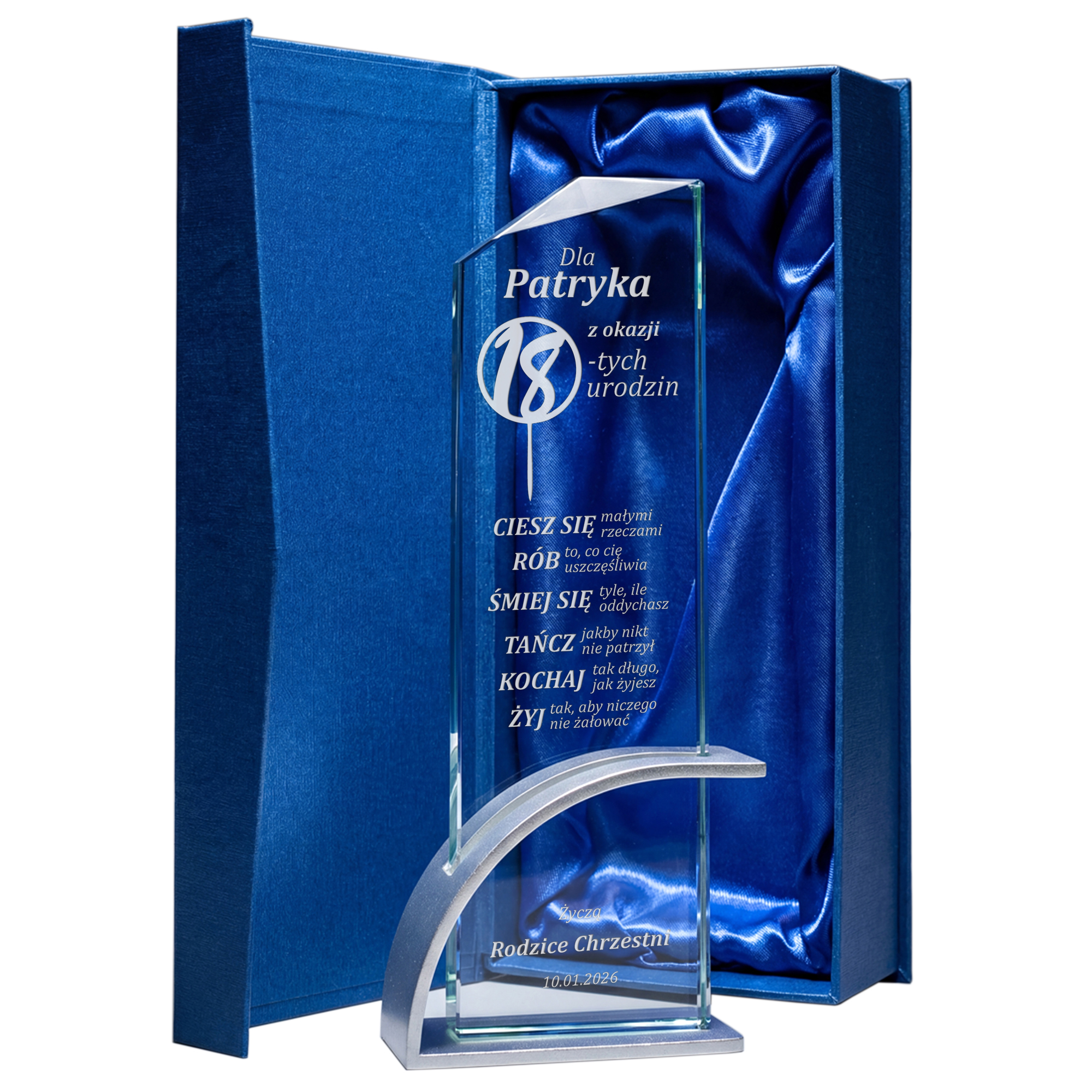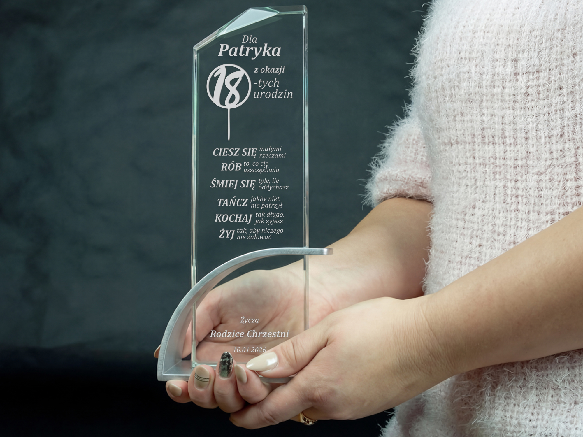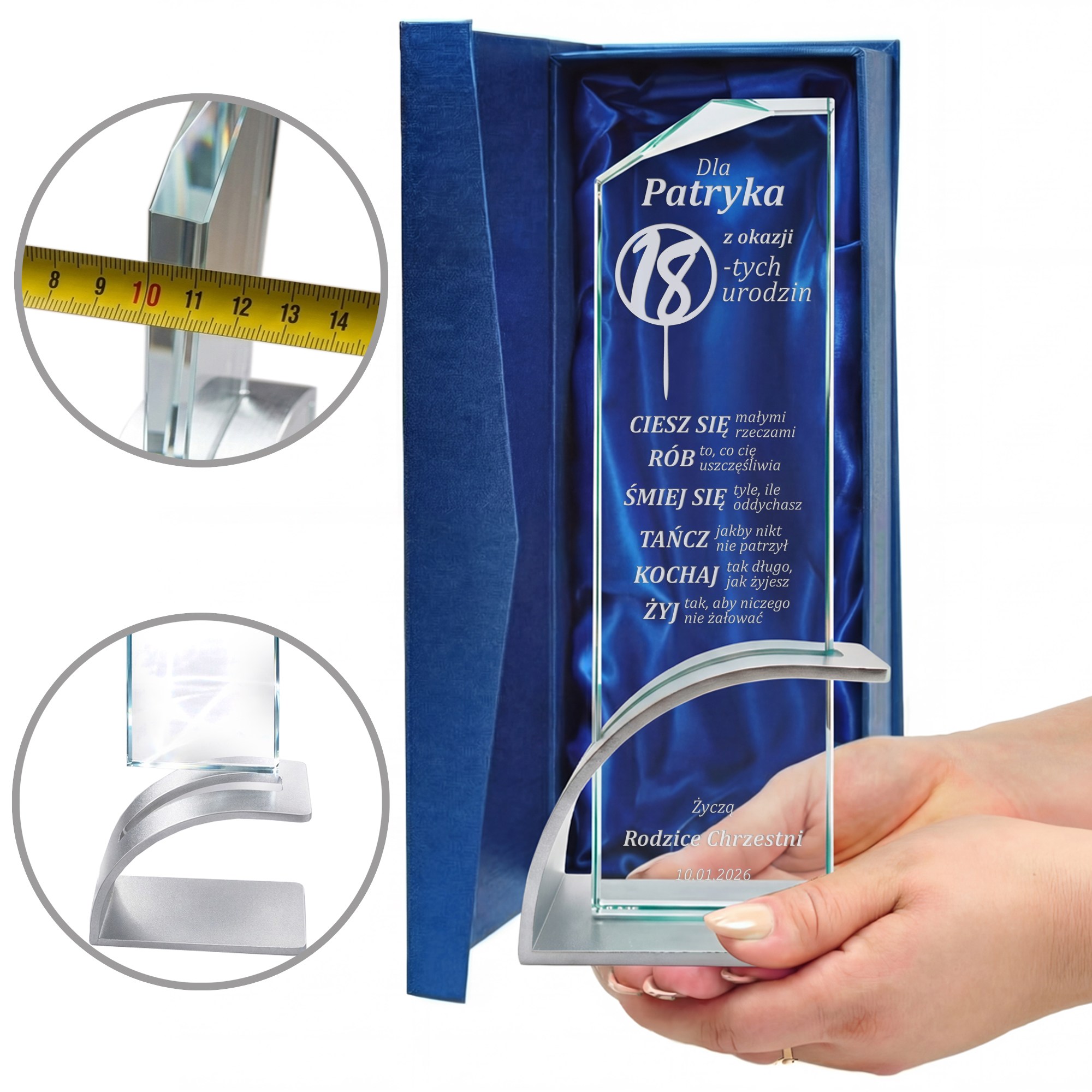 Elegancka statuetka wykonana z krystalicznie czystego szkła kryształowego to doskonały sposób na uczczenie przełomowych 18. urodzin. Dzięki zastosowaniu precyzyjnej technologii grawerowania laserowego, każde imię, data oraz osobiste życzenia zyskują wyjątkowy, nieścieralny charakter. Produkt ten stanowi nowoczesną alternatywę dla klasycznych kartek, stając się trwałą pamiątką wejścia w dorosłość na długie lata. Wyjątkowy charakter produktu podkreśla nowoczesna, łukowata podstawa wykonana z aluminium w kolorze srebrnym, która zapewnia stabilność i luksusowy wygląd. Forma statuetki oraz profesjonalnie szlifowane krawędzie sprawiają, że idealnie komponuje się ona z każdym wystrojem wnętrza. Każdy egzemplarz dostarczany jest w dedykowanym etui, dzięki czemu otrzymują Państwo prezent gotowy do wręczenia. To prestiżowy wybór dla osób szukających upominku, który łączy w sobie wysoką estetykę z głębokim, emocjonalnym przesłaniem.