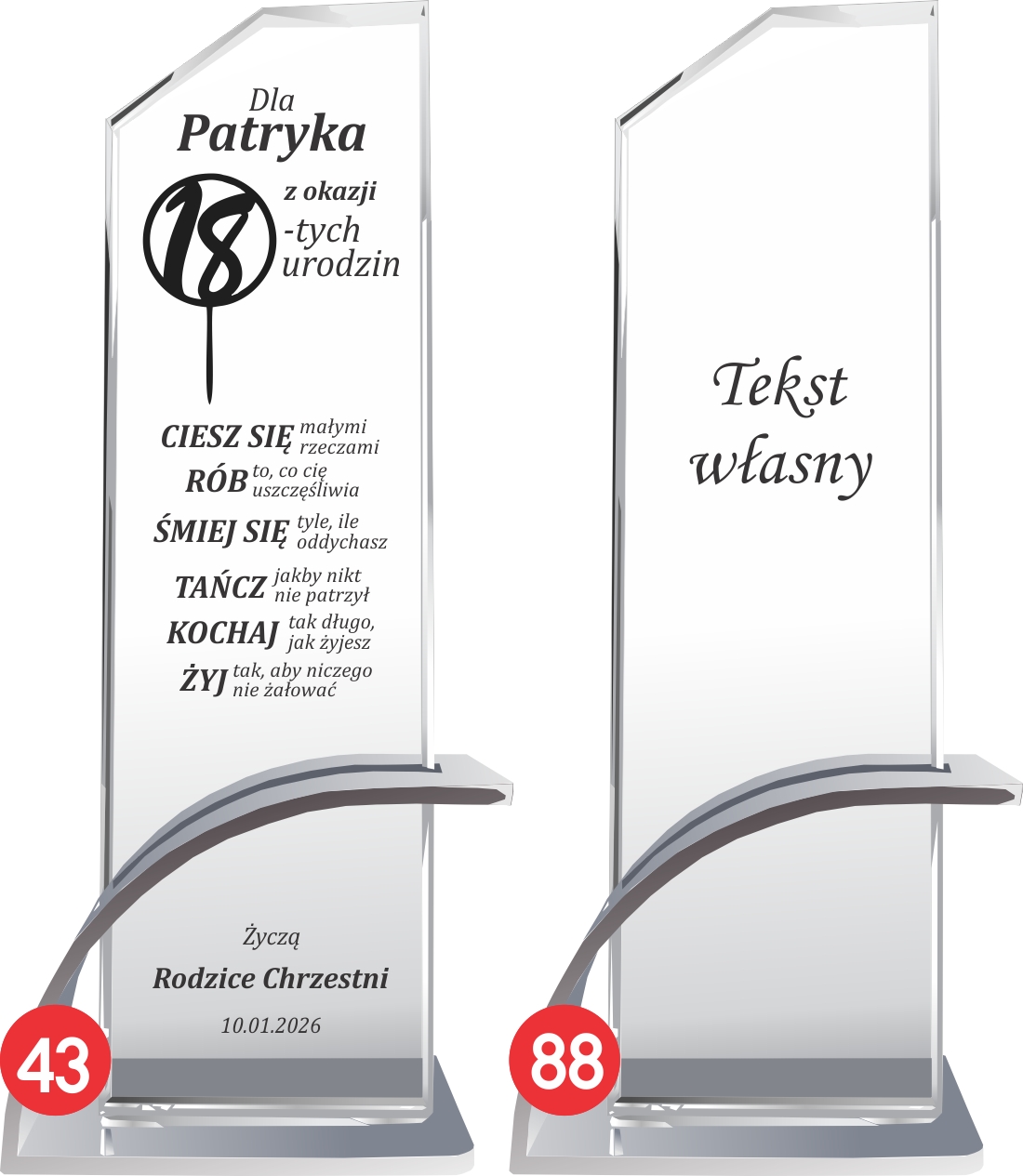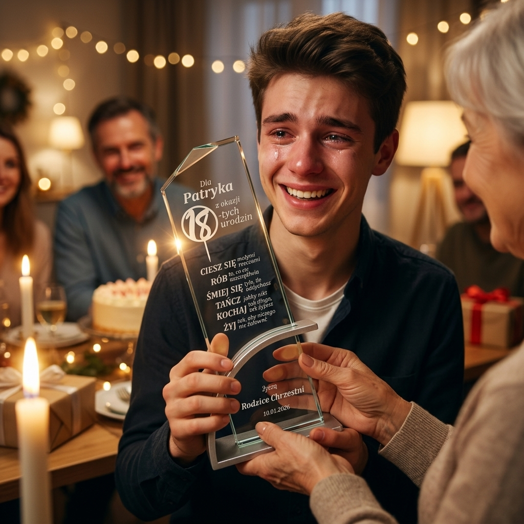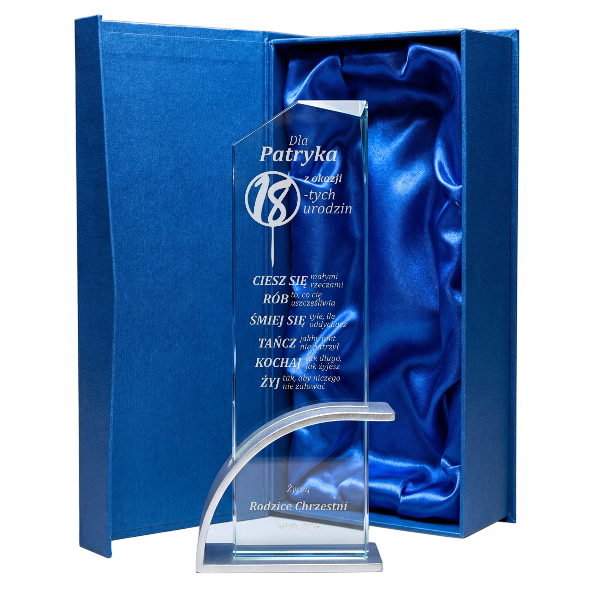 Elegancka statuetka wykonana z krystalicznie czystego szkła kryształowego to doskonały sposób na uczczenie przełomowych 18. urodzin. Dzięki zastosowaniu precyzyjnej technologii grawerowania laserowego, każde imię, data oraz osobiste życzenia zyskują wyjątkowy, nieścieralny charakter. Produkt ten stanowi nowoczesną alternatywę dla klasycznych kartek, stając się trwałą pamiątką wejścia w dorosłość na długie lata. Wyjątkowy charakter produktu podkreśla nowoczesna, łukowata podstawa wykonana z aluminium w kolorze srebrnym, która zapewnia stabilność i luksusowy wygląd. Forma statuetki oraz profesjonalnie szlifowane krawędzie sprawiają, że idealnie komponuje się ona z każdym wystrojem wnętrza. Każdy egzemplarz dostarczany jest w dedykowanym etui, dzięki czemu otrzymują Państwo prezent gotowy do wręczenia. To prestiżowy wybór dla osób szukających upominku, który łączy w sobie wysoką estetykę z głębokim, emocjonalnym przesłaniem.