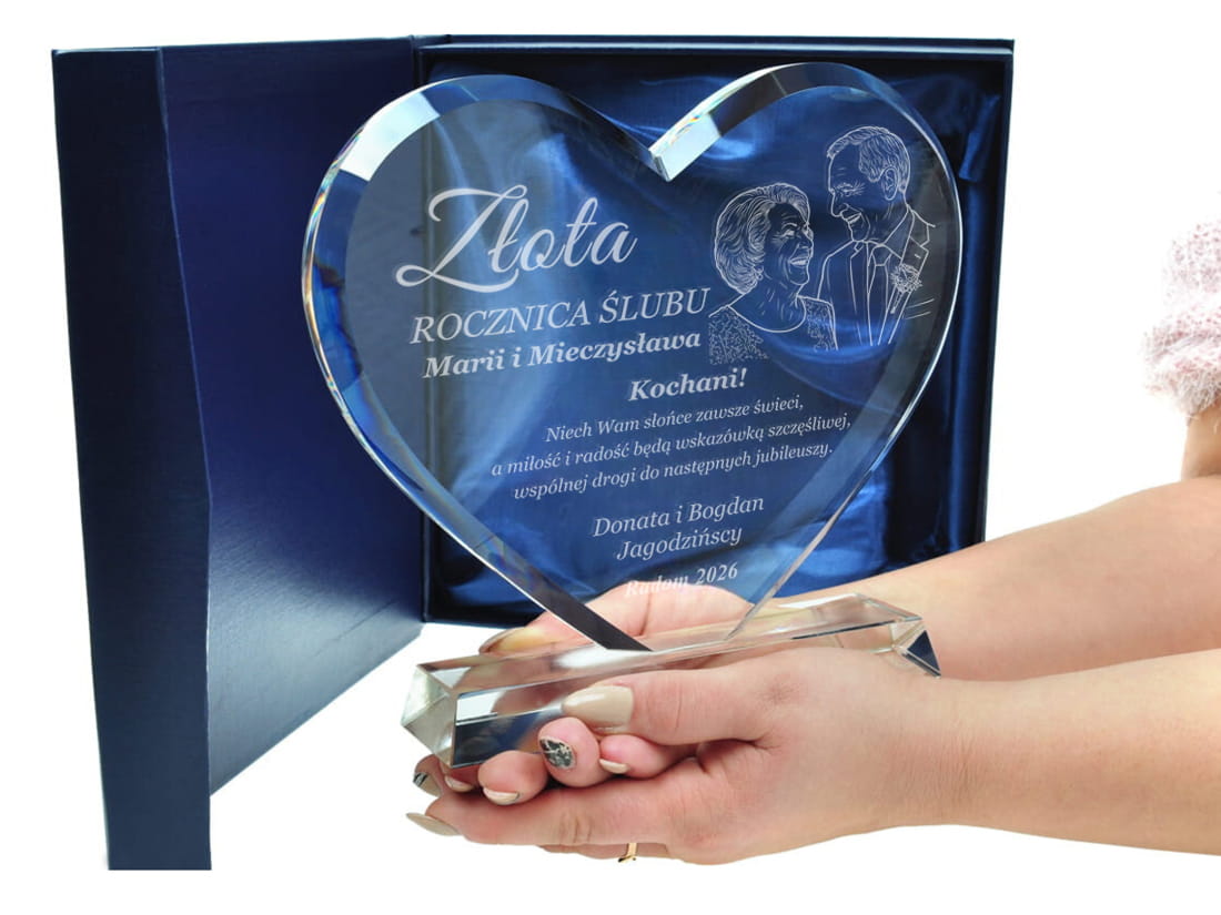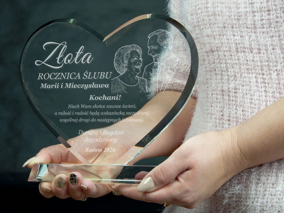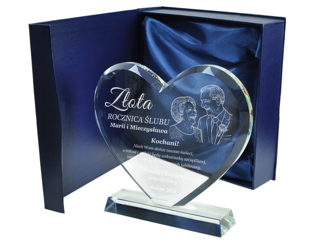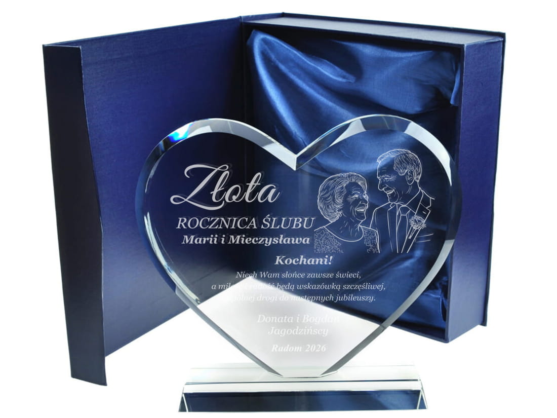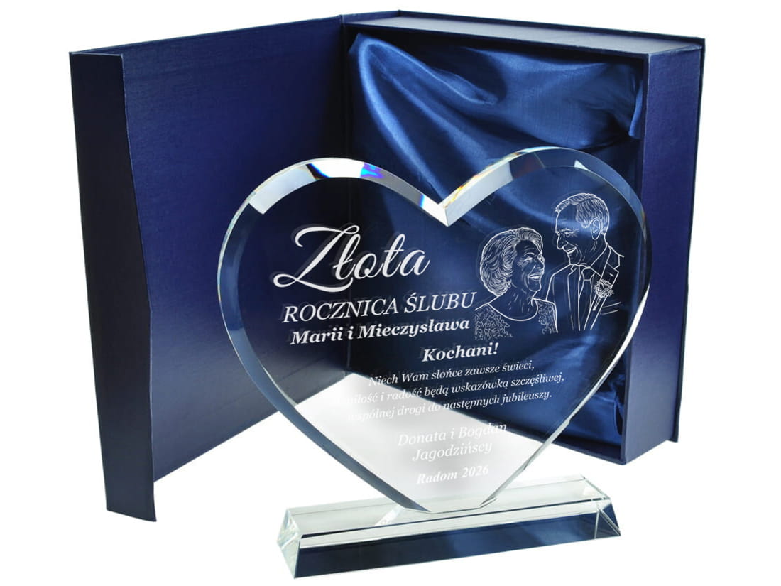 Podaruj coś więcej niż prezent – podaruj emocje, wspomnienia i historię miłości zamkniętą w szkle. Elegancka statuetka w kształcie serca, wykonana z wysokiej jakości szkła kryształowego, to wyjątkowy upominek z okazji rocznicy ślubu. Dzięki możliwości wygrawerowania zdjęcia jubilatów, prezent staje się absolutnie unikalną pamiątką na całe życie. Możliwość personalizacji pozwala na umieszczenie imion małżonków, daty ślubu oraz serdecznej dedykacji od bliskich lub samych partnerów. Solidne wykonanie i dbałość o detale czynią ją wyjątkowym upominkiem, który z pewnością wzruszy i zachwyci obdarowanych.