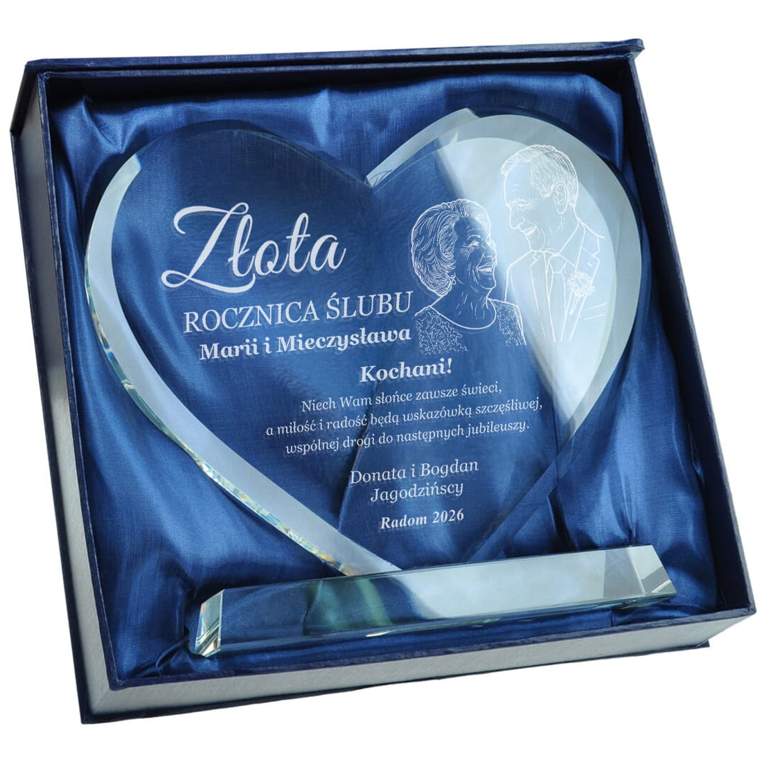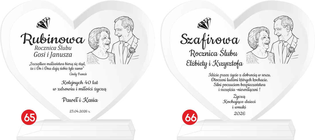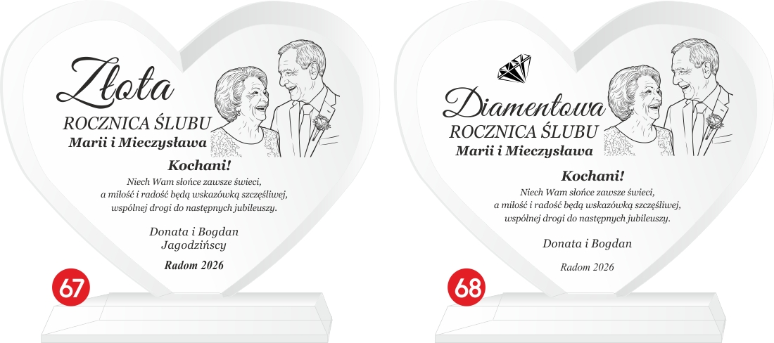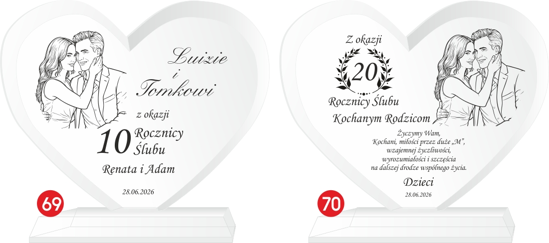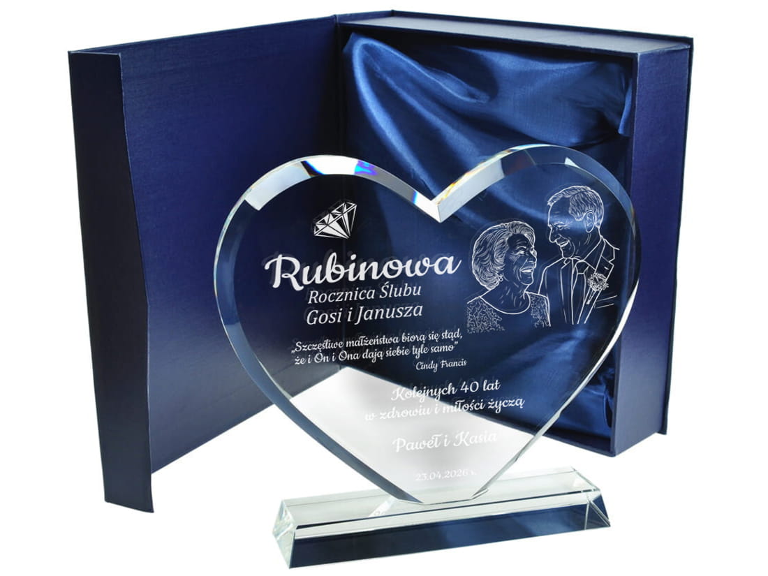 Podaruj coś więcej niż prezent – podaruj emocje, wspomnienia i historię miłości zamkniętą w szkle. Elegancka statuetka w kształcie serca, wykonana z wysokiej jakości szkła kryształowego, to wyjątkowy upominek z okazji rocznicy ślubu. Dzięki możliwości wygrawerowania zdjęcia jubilatów, prezent staje się absolutnie unikalną pamiątką na całe życie. Możliwość personalizacji pozwala na umieszczenie imion małżonków, daty ślubu oraz serdecznej dedykacji od bliskich lub samych partnerów. Solidne wykonanie i dbałość o detale czynią ją wyjątkowym upominkiem, który z pewnością wzruszy i zachwyci obdarowanych.