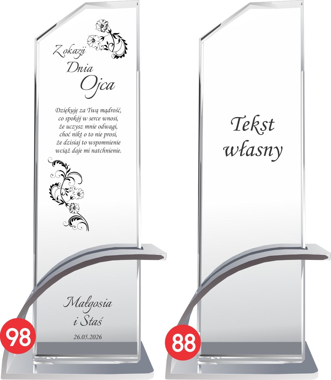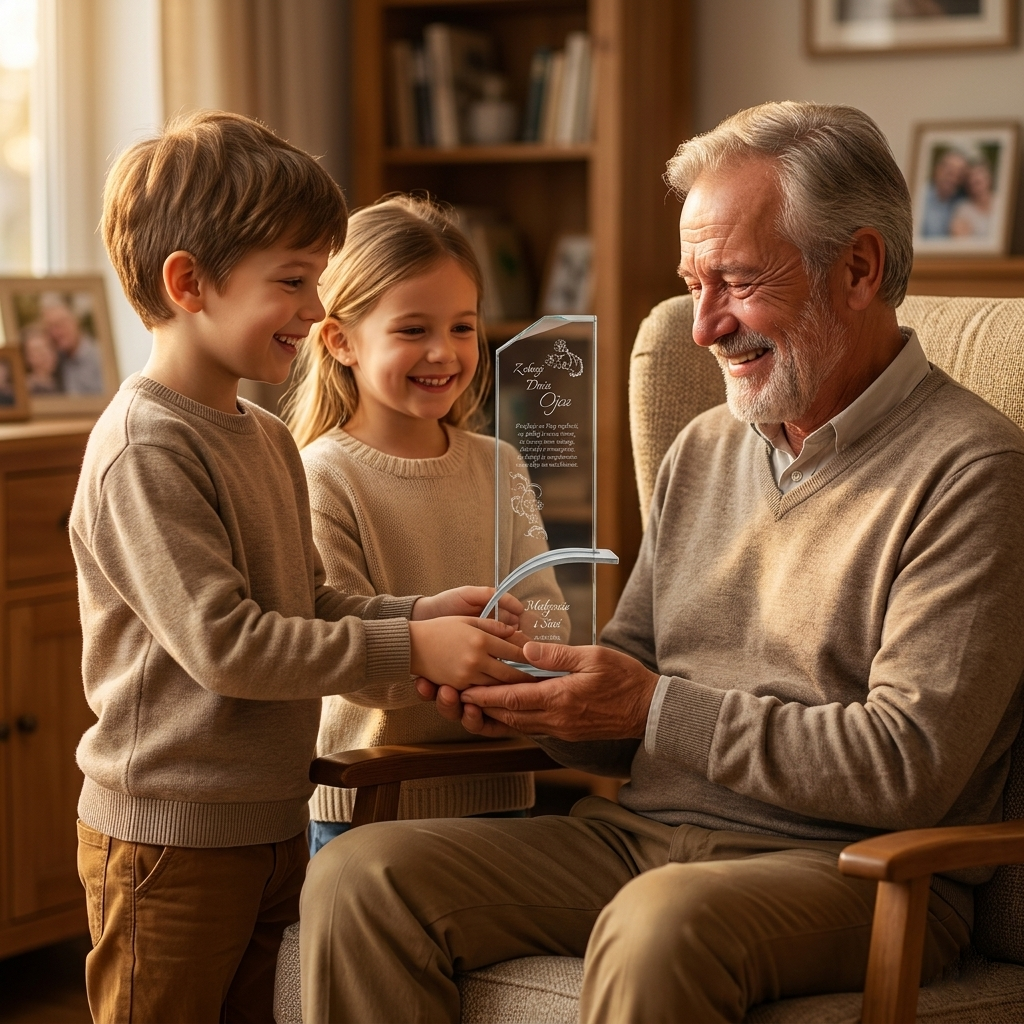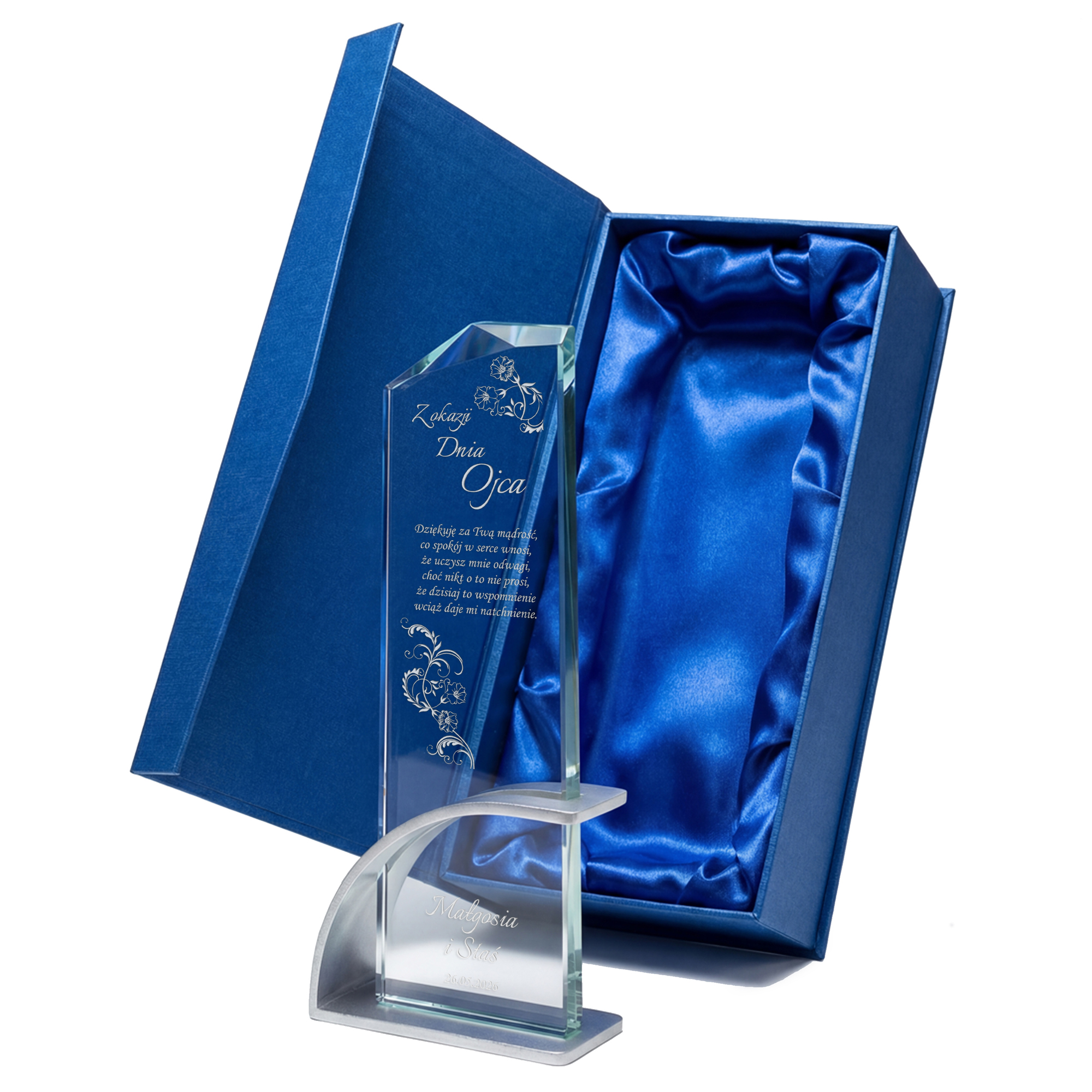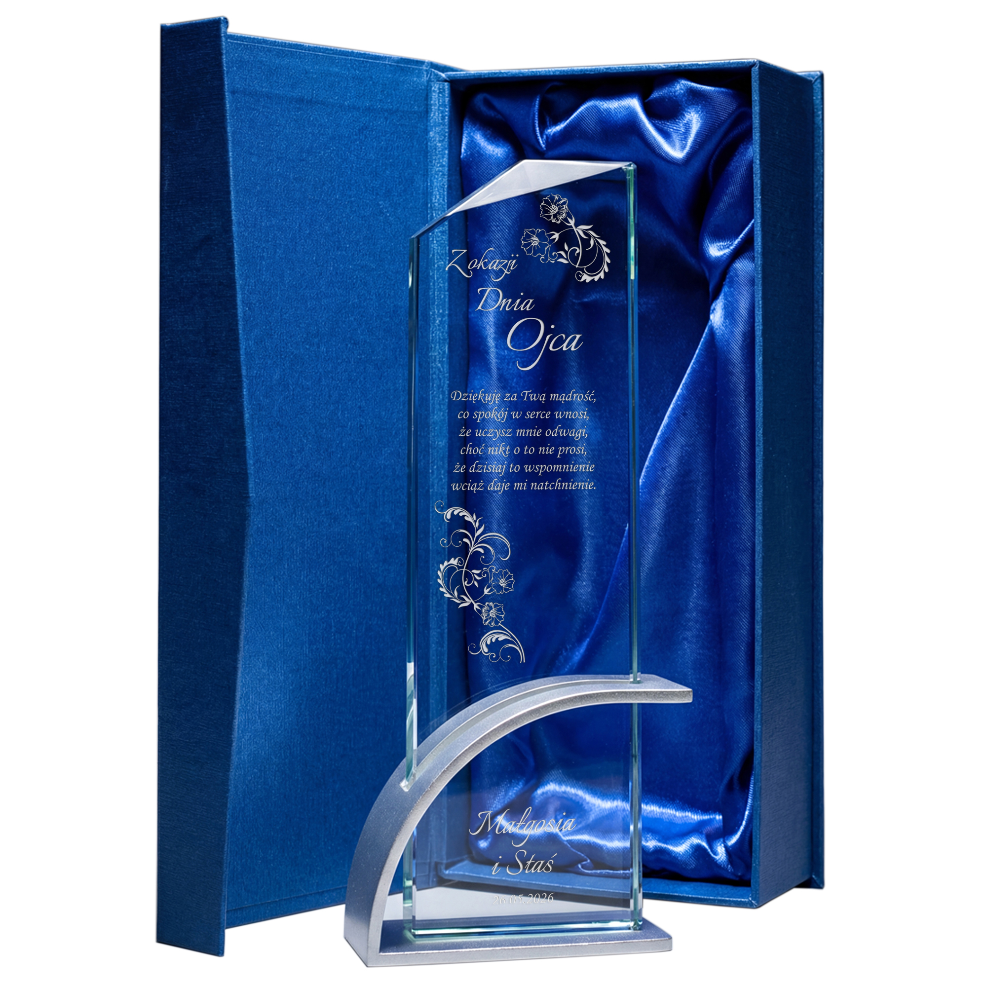 Szklana statuetka z eleganckim grawerem to wyjątkowy upominek na Dzień Ojca, który wyrazi miłość i wdzięczność w pięknej formie. Wykonana ze szkła kryształowego, zachwyca swoją przejrzystością i starannym wykonaniem, dodając prezentowi wyjątkowego charakteru. Wyjątkowy charakter produktu podkreśla nowoczesna, łukowata podstawa wykonana z aluminium w kolorze srebrnym, która zapewnia stabilność i luksusowy wygląd. Możliwość personalizacji pozwala na umieszczenie imienia taty, wyjątkowej dedykacji, ważnej daty lub pięknych słów podziękowania. Statuetka może zawierać treść symbolizującą ojcowską miłość i troskę, czyniąc ją wzruszającą pamiątką na długie lata. Jej ponadczasowy design sprawia, że będzie piękną ozdobą każdego wnętrza, przypominającą tacie o wyjątkowej więzi z dziećmi. Solidne wykonanie i dbałość o detale sprawiają, że prezent nabiera elegancji i stanowi niezwykle wartościowy upominek. To doskonały sposób, aby w wyjątkowy sposób podziękować ojcu za jego miłość, wsparcie i poświęcenie, które okazuje każdego dnia.